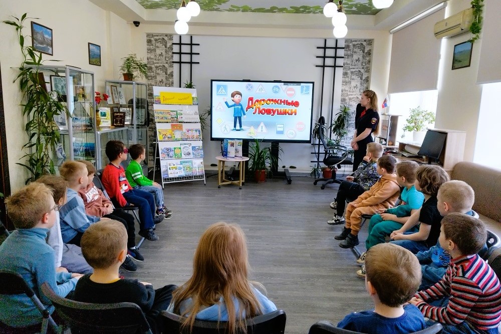 В апреле библиотека им. И.У. Басаргина провела познавательное путешествие для воспитанников старшей логопедической группы №1 МБОУ «Центра развития ребенка детского сада № 145» на тему «В стране Светофории». На мероприятие был приглашен инспектор по пропаганде БДД ОГИБДД УМВД России по городу Владивостоку лейтенант полиции Зиборова Татьяна Михайловна. Она провела игровой познавательный урок по безопасности на дороге. Во время занятия были разобраны наиболее часто встречающиеся ситуации на дороге, «дорожные ловушки», необходимость присутствия на верхней одежде пешеходов светоотражающихся элементов, на какой сигнал светофора необходимо идти пешеходу, как надо себя вести при переходе дороги и в транспортных средствах. Напомнили ребятам о Правилах дорожного движения при управлении велосипедами и о разрешенных мест для катания на велосипедах, самокатах и роликовых коньках. С выражением дошкольники читали стихотворение «Светофор», а также играли всей группой в игру на внимание «Светофорчик», где под заданные цвета (красный, желтый, зеленый) выполняли движения. В завершении занятия ребятам подарили памятки по безопасности дорожного движения от ГБДД.