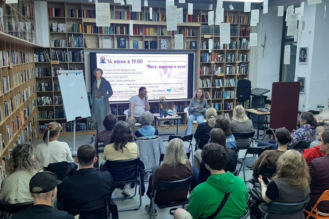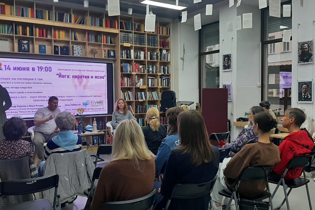 14 июня, в преддверии международного дня йоги, в библиотеке «БУК» состоялась открытая лекция-практикум «Йога: коротко и ясно», на которой гости мероприятия узнали о том, что такое йога, и какие преимущества она может принести обычному человеку. Ведущие, Александр Кудинов и Ольга Ратуша, сертифицированные учителя международного гуманитарного фонда «Искусство жизни», рассказали о целях, методах и видах йоги, а также о том, как она может улучшить качество жизни и даже судьбу. В качестве практической части, эксперты познакомили участников с простыми техниками дыхания и медитации, которые не требуют специального оборудования и помогают расслабиться и сфокусироваться.