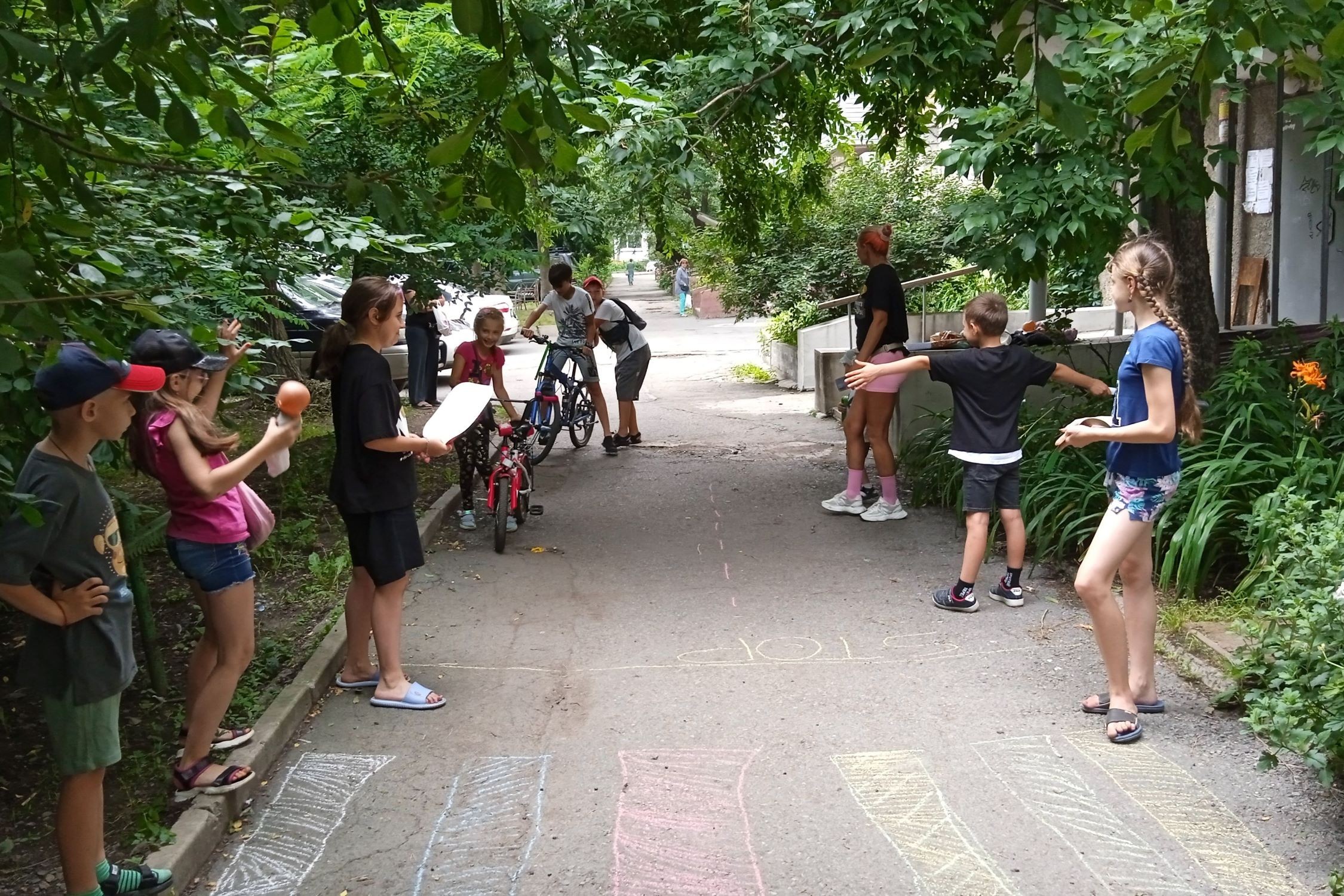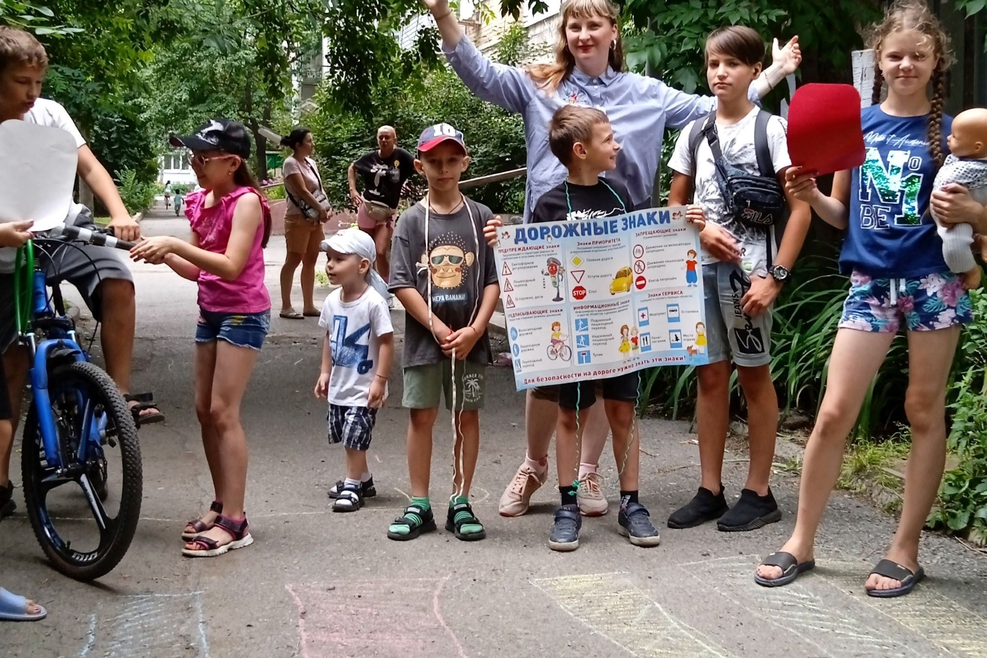 Теплые летние дни позволяют сотрудникам библиотеки проводить мероприятия для детей на придомовой территории. Библиотека № 13 организовала 21 июля для детей, жителей дома, в котором расположена библиотека, по ул. Русская, 78 День дорожного движения.