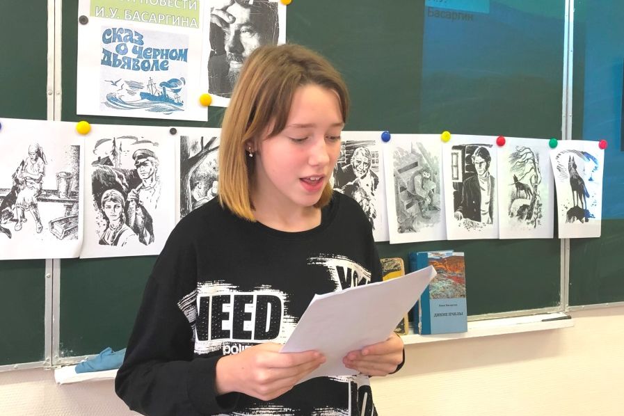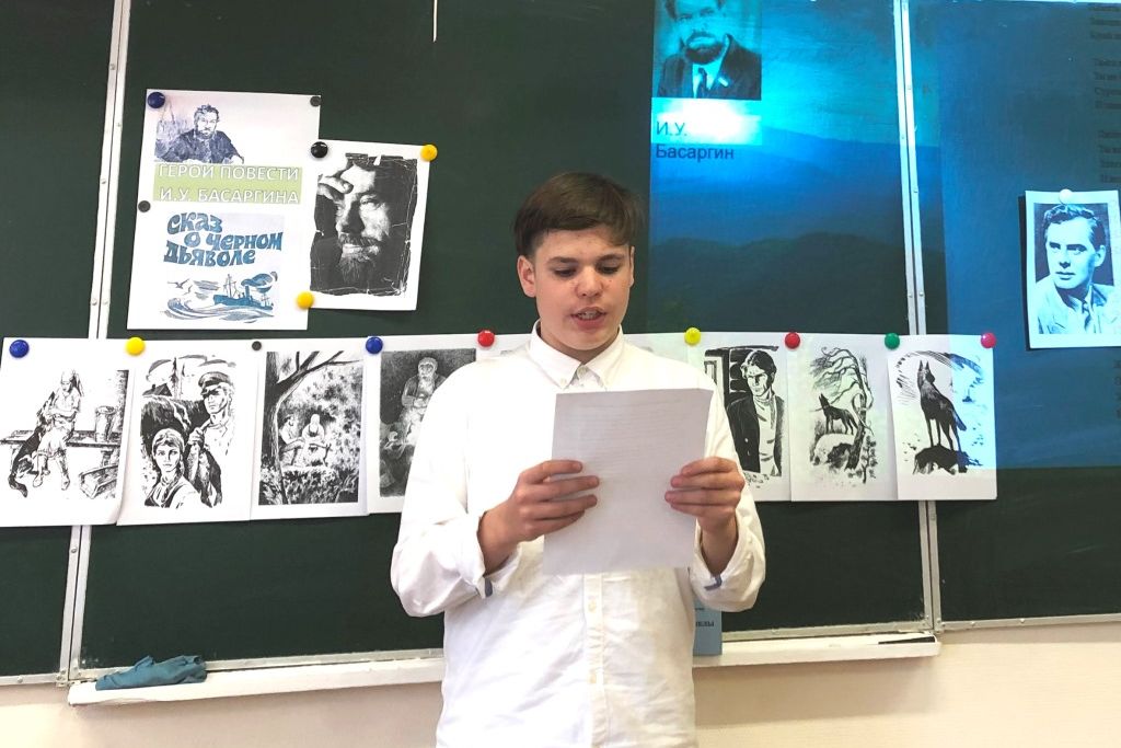 Далее учащиеся класса представили исследовательские работы «Герои и прототипы повести И.У. Басаргина «Чёрный Дьявол» и «Цитатный образ и характеристика Федора Козина из повести И.У. Басаргина «Сказ о Чёрном Дьяволе».