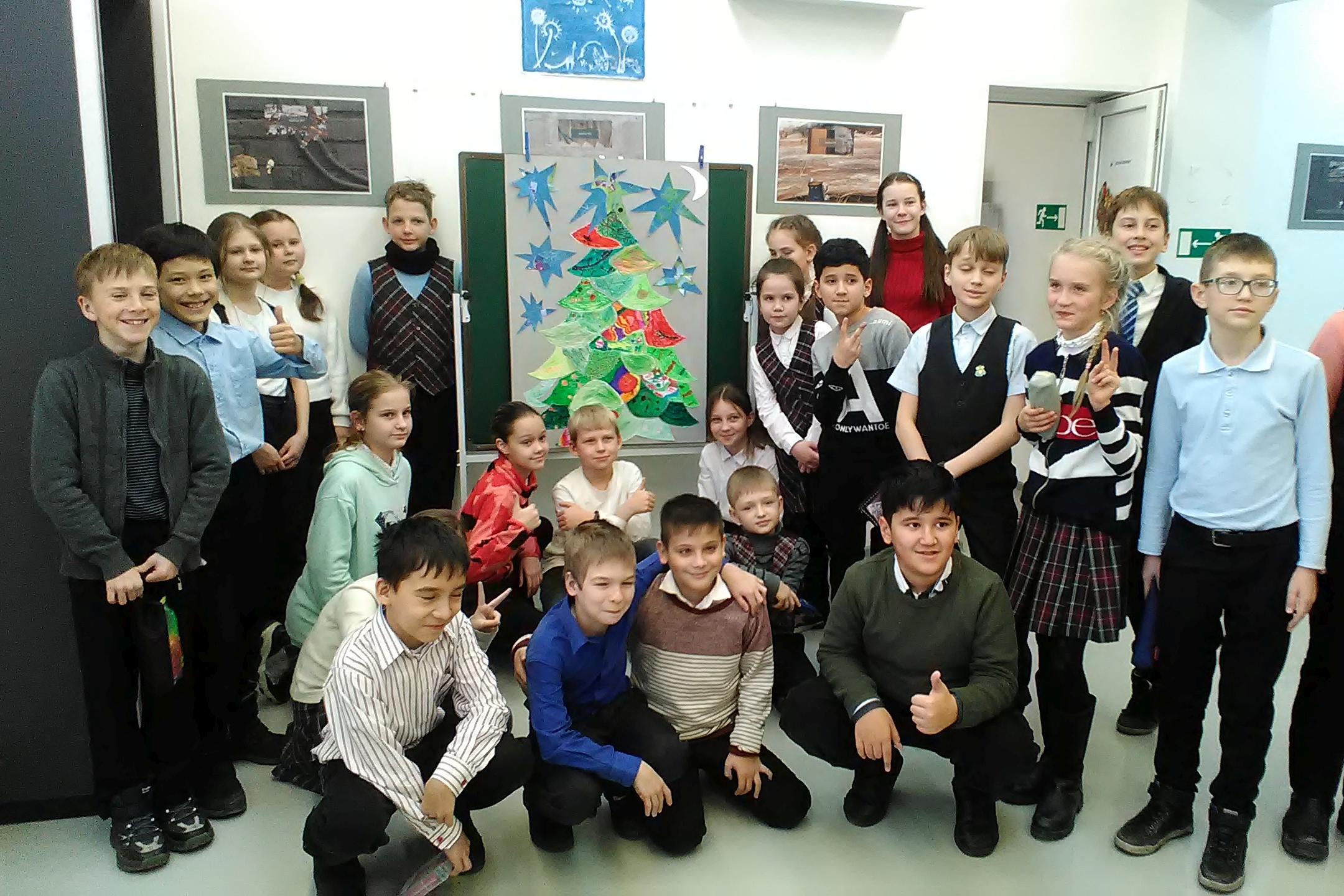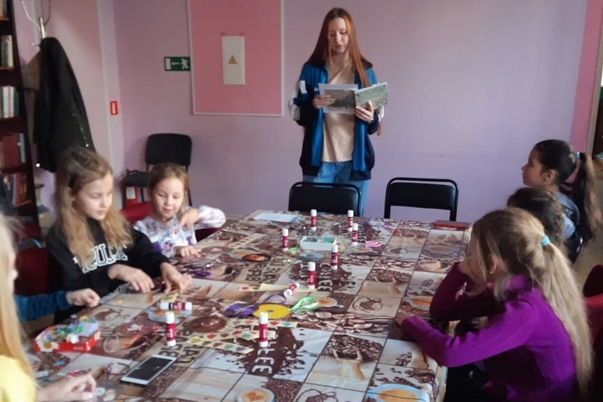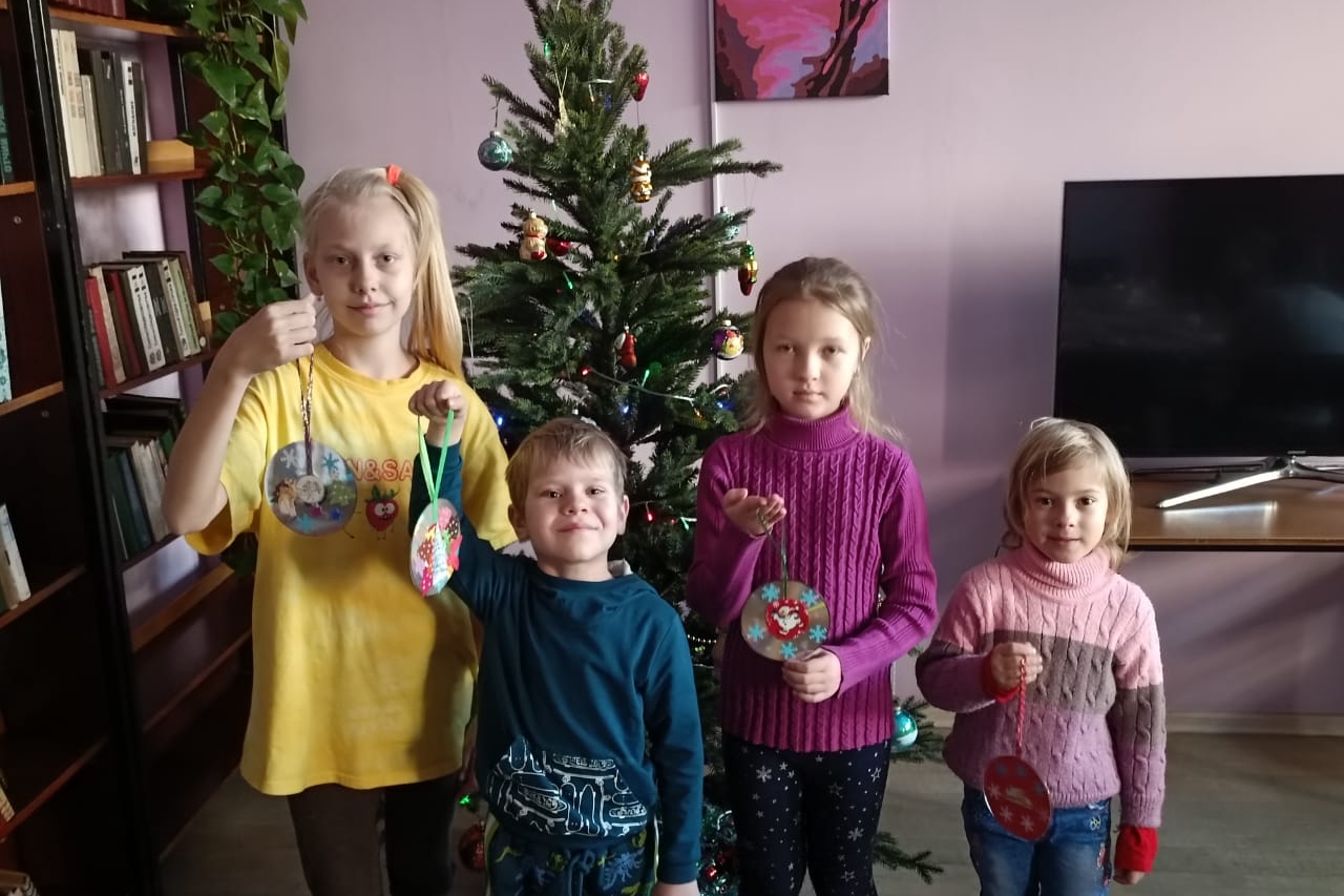 Четвероклассники в библиотеку пришли с цветными карандашами и фломастерами. Каждый получил по мини-кусочку ватмана, раскрасил его, а потом из этих фрагментов сложили на картоне елку. Мальчишки-энтузиасты Богдан и Никита проверили, хорошо ли приклеен каждый фрагмент и добавили к звездам над новогодней елкой месяц. После сборки елки школьники отправились в кинозал, чтобы посмотреть мультфильмы и короткометражку Елены Дубровской «Новогодний подарок». Добрая история о судьбоносном утреннике для девочки из детского дома тронула четвероклассников, они смотрели фильм очень тихо.