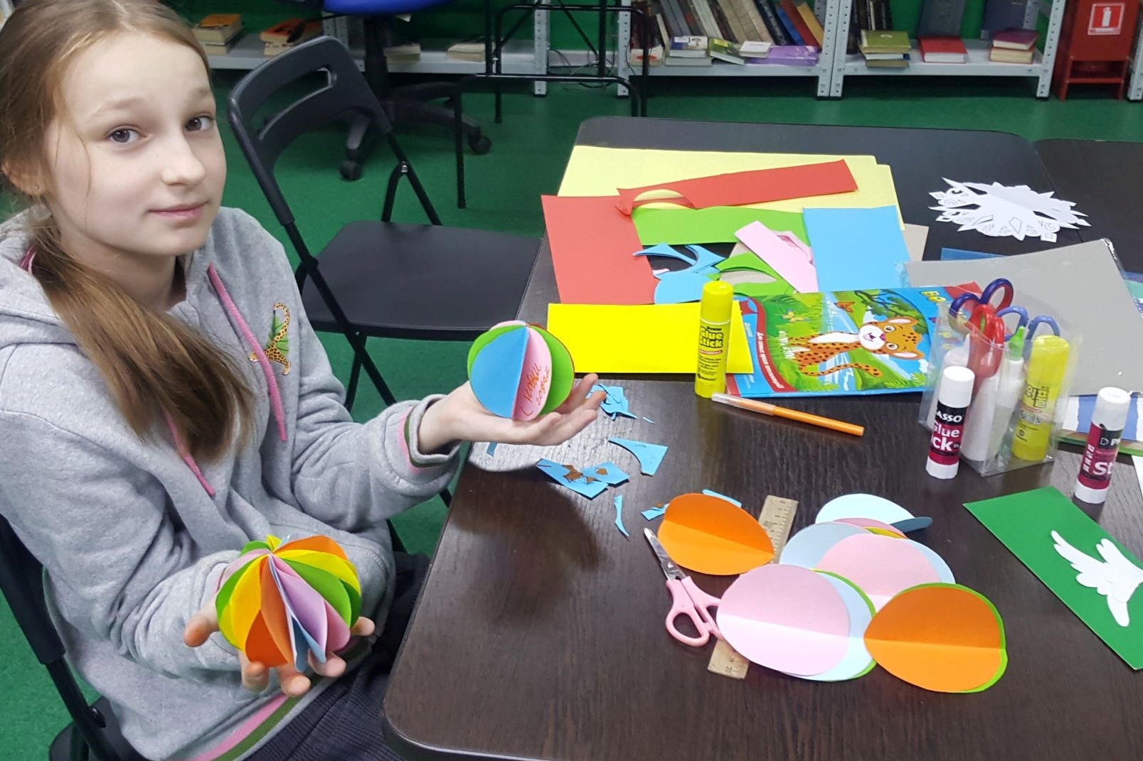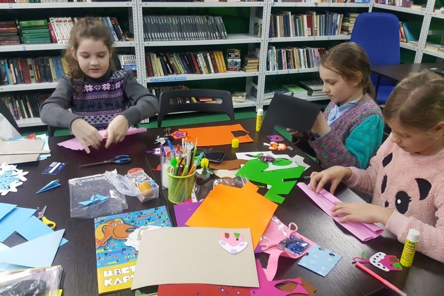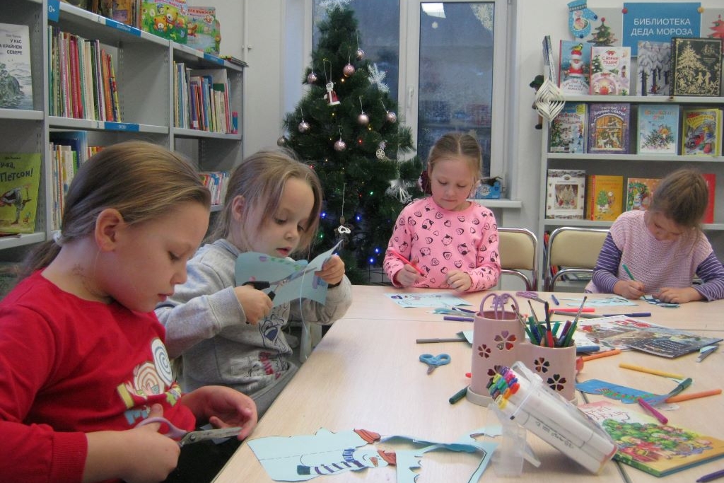 Пока четвероклассники одевались, строились и прощались с библиотекарями, на детский абонемент стали подтягиваться малыши, из тех, кто постоянно приходит на творческую мастерскую. Месяц новогодних поделок продолжатся, в этот раз дети вырезали, раскрашивали и клеили открытку в виде голубого снеговика.