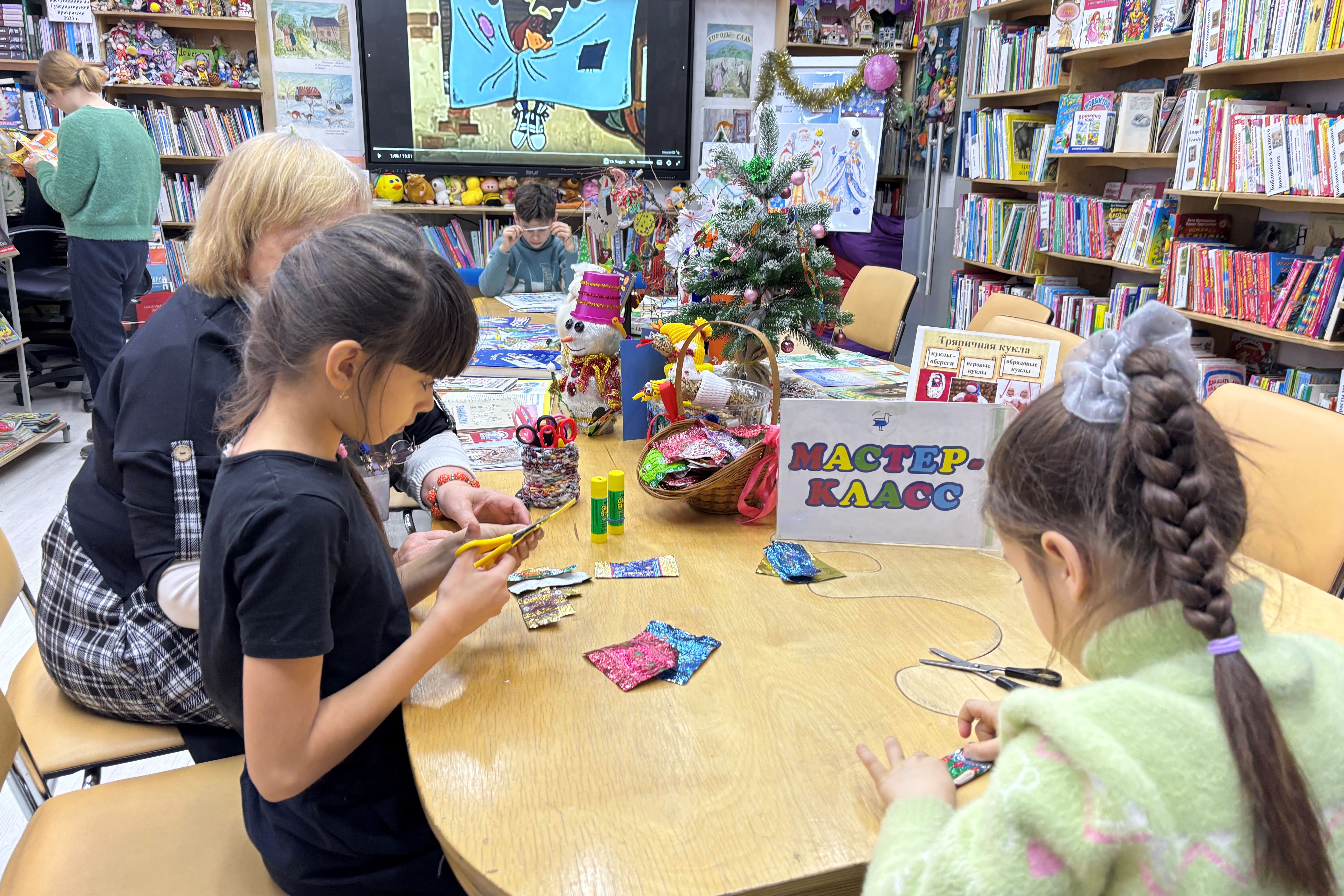 Новый год – самое время для поделок. В библиотеке позаботились о том, чтобы юные читатели успели изготовить своими руками новогодние поделки, которые могут украсить елочку. Они мастерили из конфетных фантиков украшение для елочки – яркую и нарядную гирлянду. А потом с интересом слушали истории про русскую тряпичную куклу и из тряпочек терпеливо делали игровую куклу Колядушку, ведь скоро праздник Святки. Работа эта оказалась не такой простой, но девочки справились.