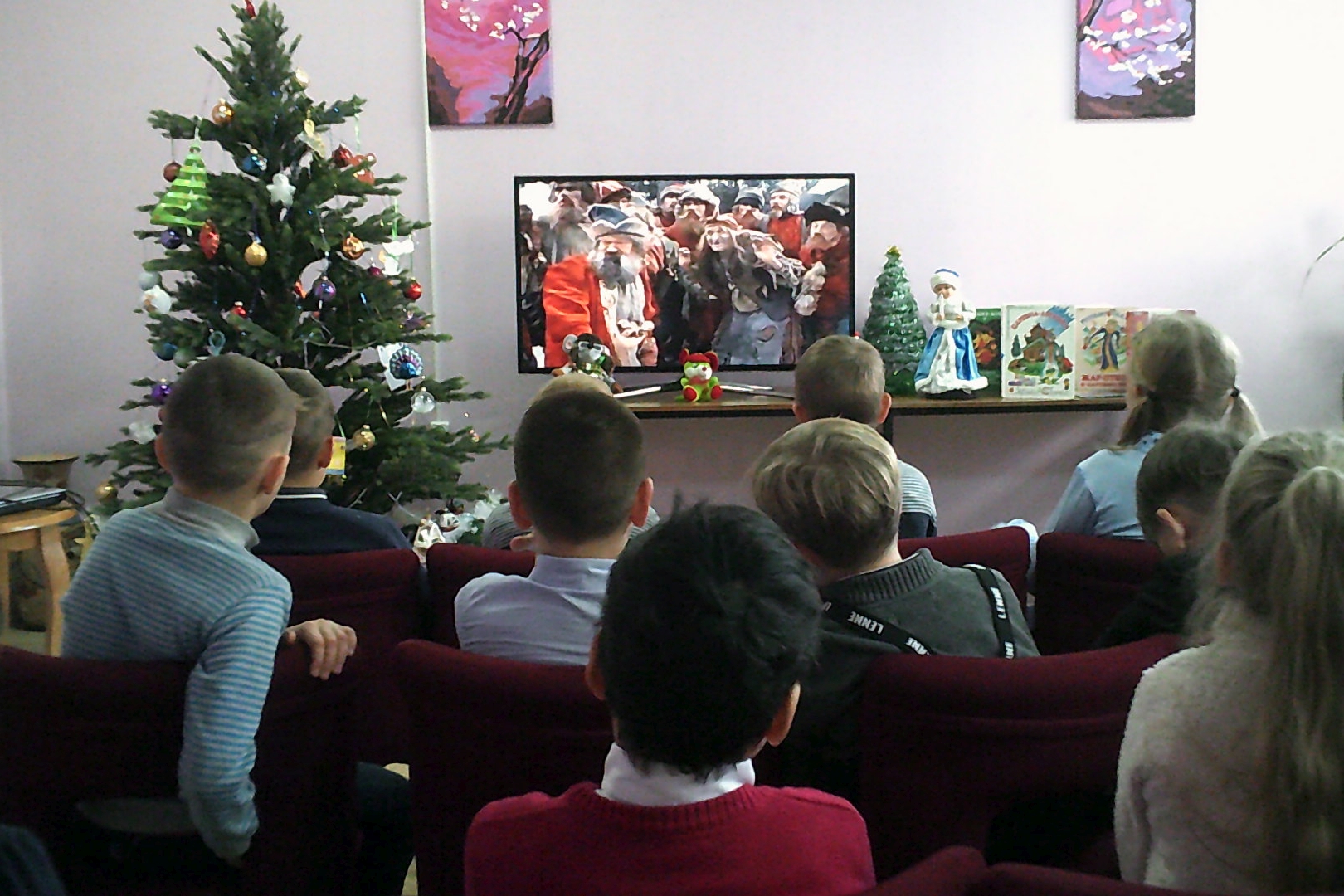 Школьники посмотрели фрагменты из фильмов «Варвара-краса Длинная коса», в котором Г. Милляр сыграл Чудо Юдо Беззаконное, и «Морозко», где актер выступил в своей любимейшей роли Бабы Яги.