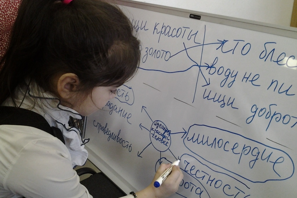 Прочитав притчу В.А. Сухомлинского «Красота», убедились, что как мы видим, красивое или безобразное зависит от самого человека. В подтверждение притчи ребята размышляли над историей двух подружек – красавицы Карины и скромницы Даши, а так же Художнике, который в неприметной и скромной Даше сумел разглядеть ее грацию, тонкость, нежность. Пытаясь создать портрет идеального человека, ребята заполнили его душу теми качествами, которые делают его красивым изнутри: милосердие, доброта, честность, смелость, справедливость, сострадание.