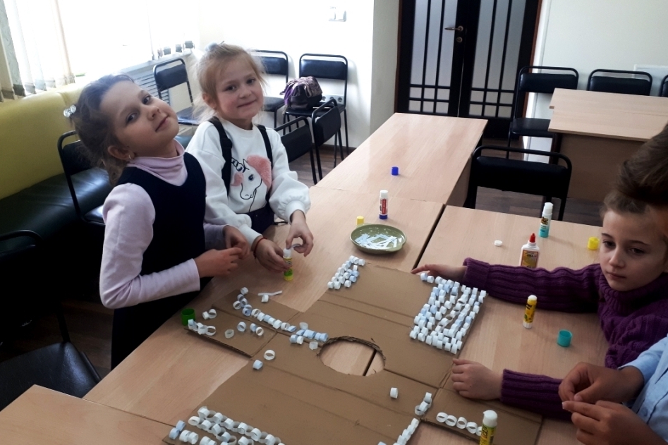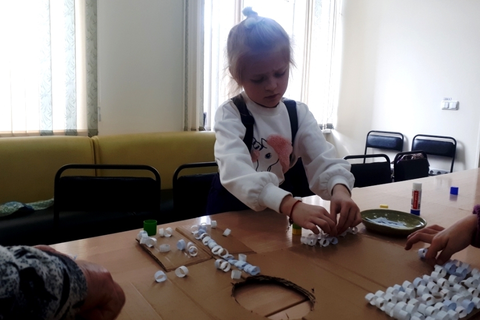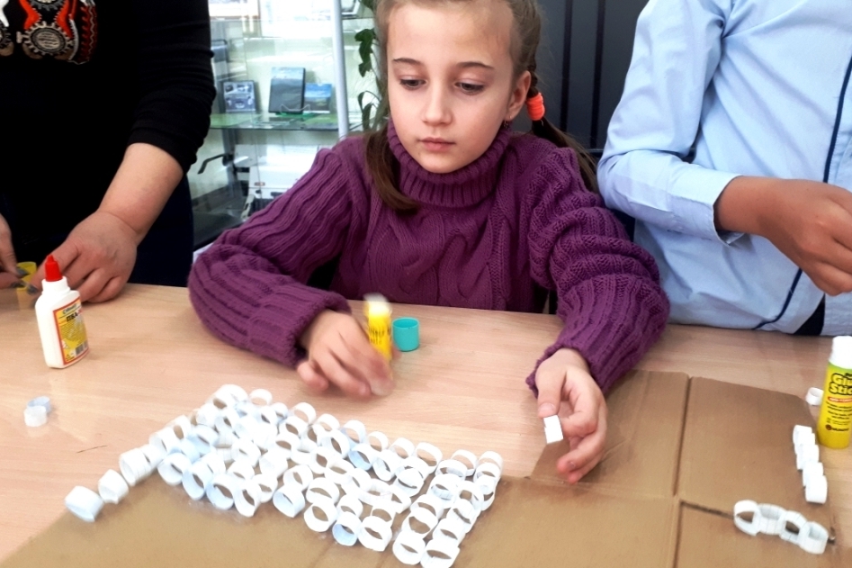 Затем Раиса Григорьевна Цилюрик провела мастер-класс «Кольчуга своими руками». Ребята мастерили рубаху из бумажных колец и узнали, что кольчуга это металлическая сеть, для защиты от поражения холодным оружием. Кольца, составляющие сеть, первоначально не соединялись вместе, но неподвижно нашивались на кожаное платье, закрепляясь или одно возле другого или же рядами, нанизываясь для этого на стержень.
