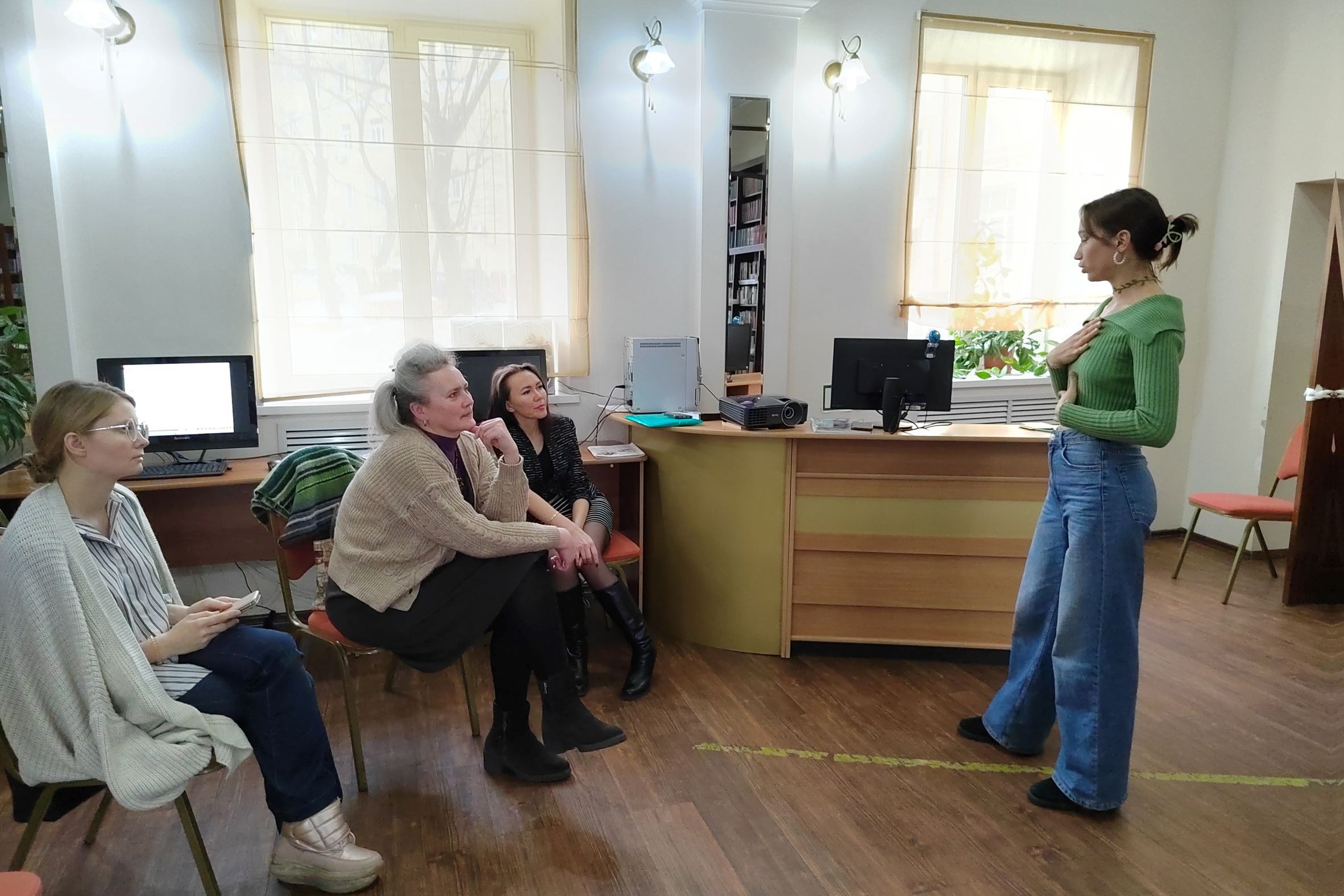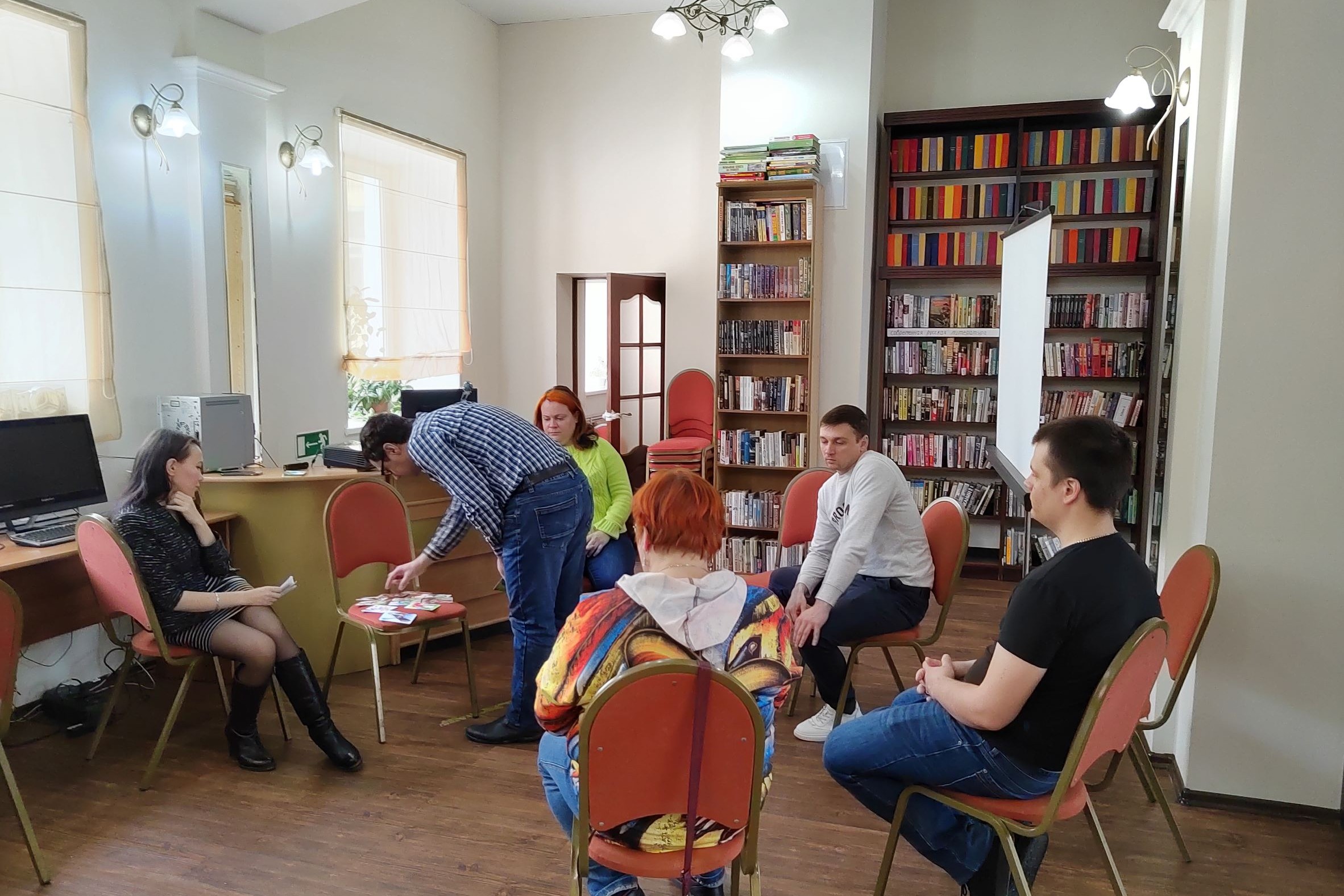 Далее взрослые читатели приняли участие в психологическом тренинге «Архетипическая модель взаимоотношений с противоположным полом». Тренер-психолог Ольга Шульгина познакомила участников с методом символдрамы. Понятие «символдрама» (от греч. symbolon — условный знак и drama — действие) — одно из направлений современной психотерапии. Отметим, символдрама – исцеляющее переживание образов. Символдраму ещё называют методом «сновидений наяву». Как рассказала психолог, основу символдрамы составляет фантазирование в форме образов на свободную или заданную специалистом тему (мотив). И т.к. тема была задана как модель взаимоотношений с противоположным полом, участники практиковались в представлении образов на противоположном берегу реки. Причём реки все участники видели разные, как и образы, которые они видели на противоположном берегу были разными. Кто-то встретился с объектом в фантазии на своём берегу, кто-то – на противоположном, а кто-то – в реке. Ольга Шульгина помогла понять и расшифровать фантазии. А сначала участники тренинга работали с метафорическими картами, пытаясь с их помощью увидеть себя – свой образ явный и свою скрытую силу, возможности. От библиотекарей читатели узнали о возможностях библиотеки и разделе «Психология и самопознания», и после мероприятия новые и старые читатели библиотеки отправились изучать содержание раздела.