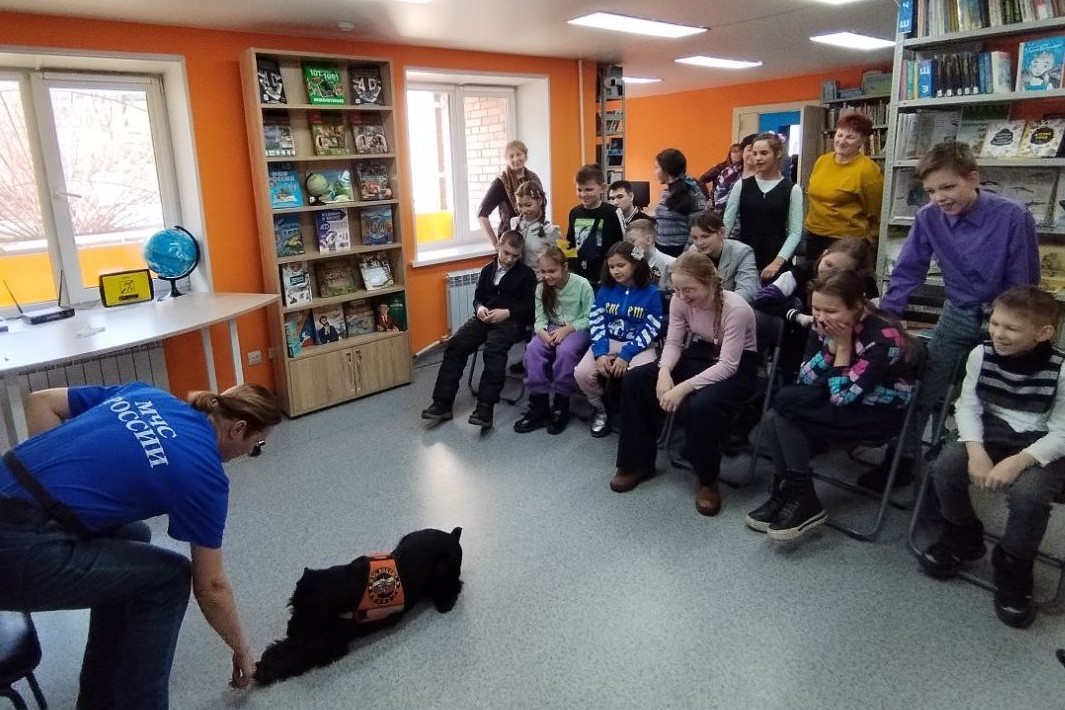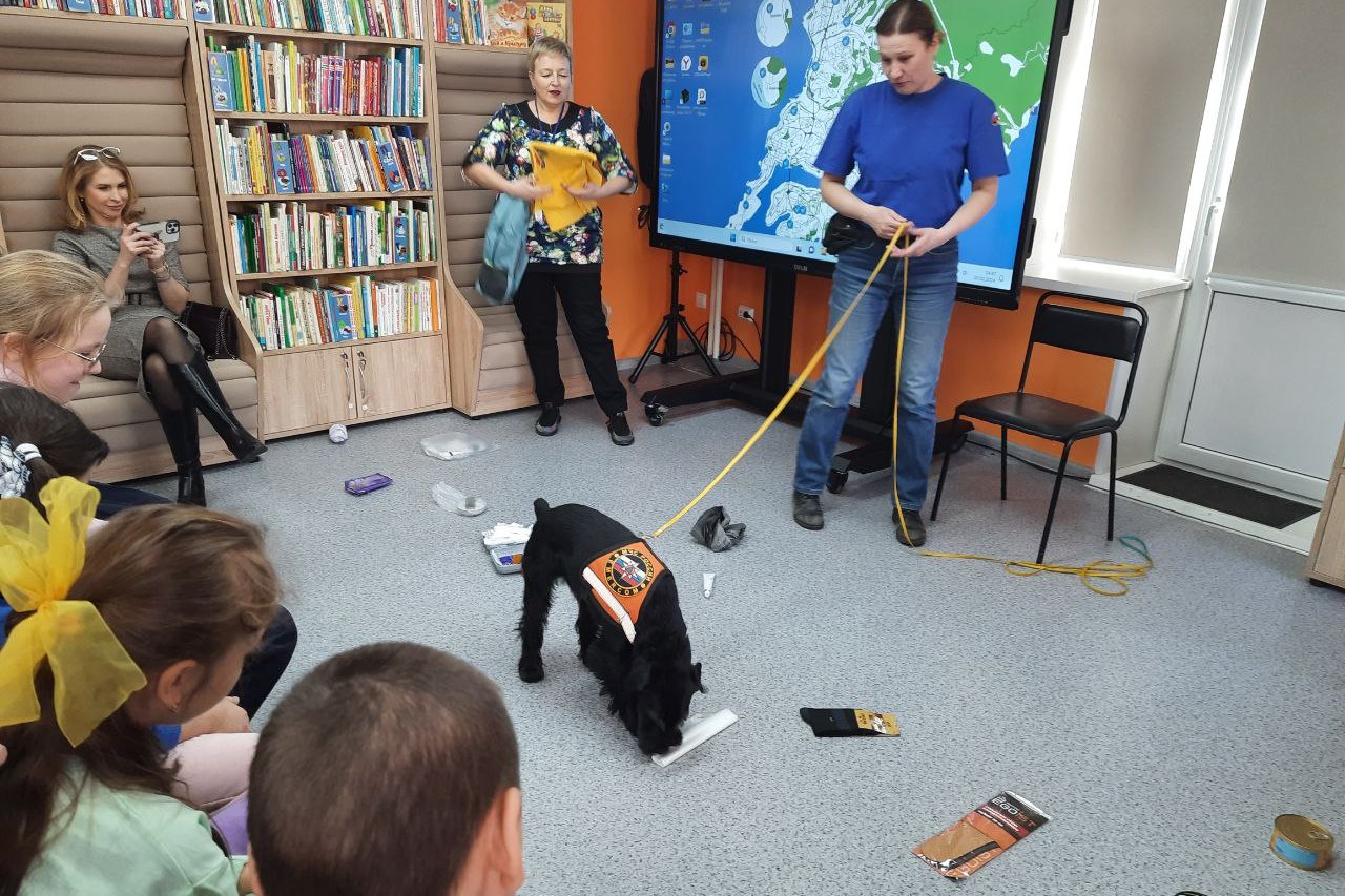 Гости библиотеки с интересом изучали принцип действия специального оборудованного рабочего места для людей с ОВЗ, особенно стол с микролифтом и наличие сразу двух клавиатур, одна из которых предназначена для читателей с нарушением зрения. Конечно, заинтересовались работой мультстудии «КНИГОмультик», с интересом расспрашивали о занятиях, о планах студии. Продолжился интерактив встречей новых друзей с профессиональным кинологом. Вновь в библиотеку пришли Екатерина Валерьевна Воронцова – спасатель ПСП (кинологическое) Главного управления МЧС России по Приморскому краю, кинолог, зоопсихолог, специалист по поведению собак и четырехлетний миттельшнауцер Достояние Прикамья Вольт.