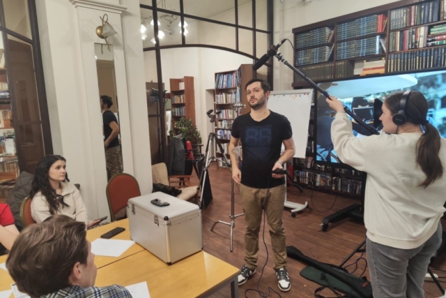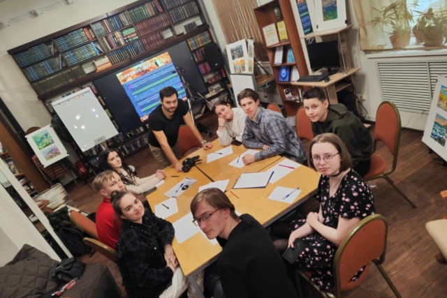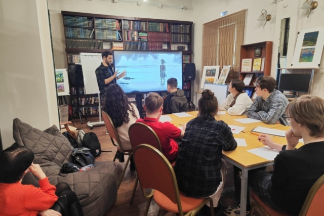 Илья Федоров, заведующий библиотекой, открыл мероприятие, рассказав о киноиндустрии изнутри: какие цеха существуют на съёмочной площадке, и как взаимодействуют они между собой.