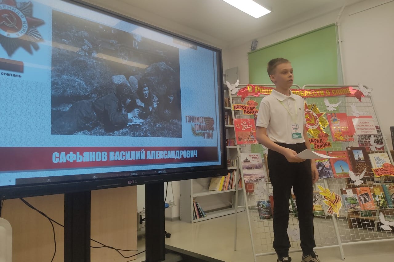 Рузайкин Семён принёс Орден Отечественной войны 2 степени, которым был награждён его прадед Сафьянов Василий Александрович (гвардии старший сержант мехводитель Танка Т 34) и рассказал о его героизме на войне. Егор Рузайкин исполнил стихотворение «Спасибо ветерану». Это было очень трогательно, чувствовалась связь поколений.