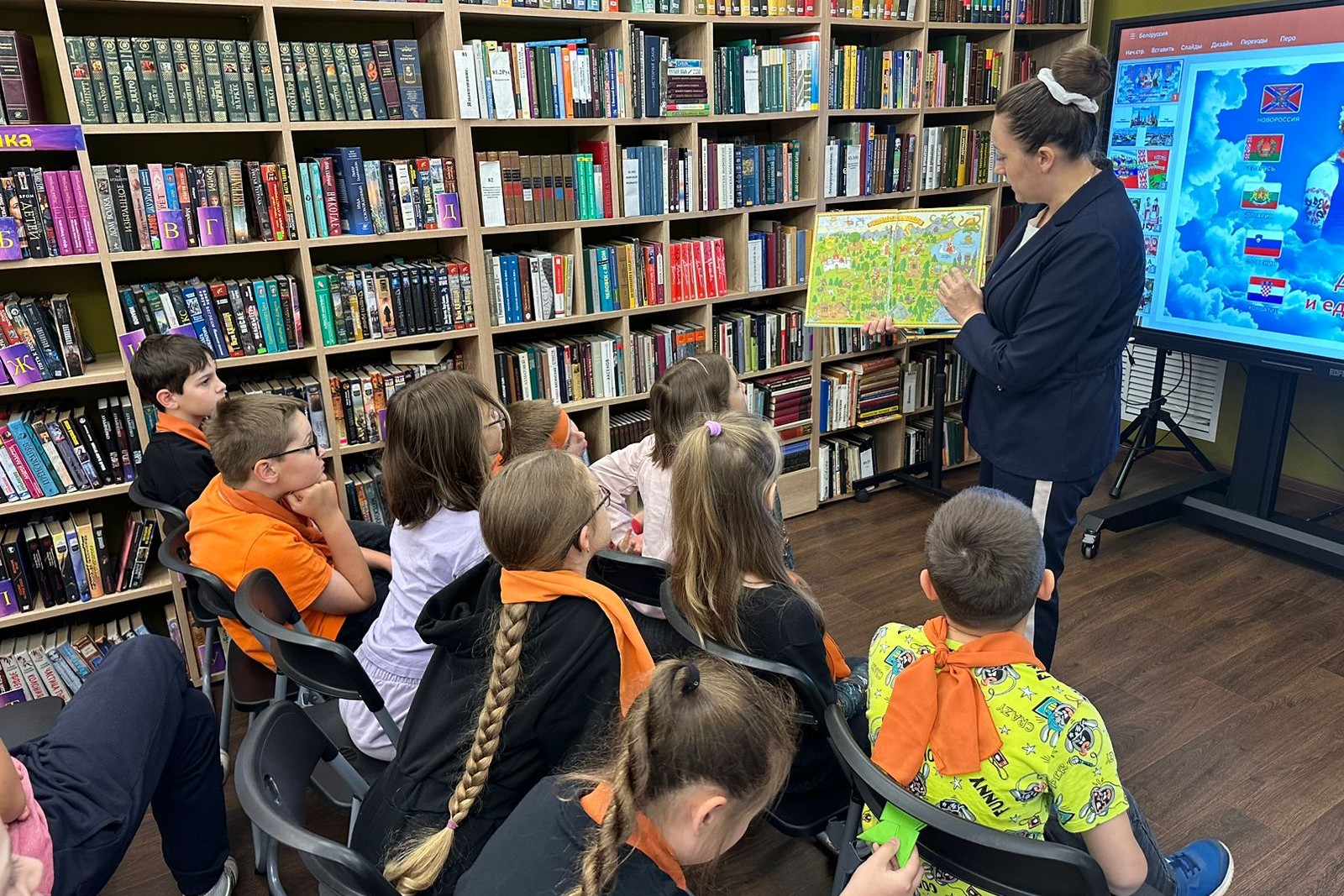 25 июня библиотеку № 4 посетили ребята из пришкольного лагеря «Восточной школы» и стали участниками исторического калейдоскопа «У культуры нет границ, но есть традиции». Ребята с удовольствием вспомнили о единых истоках славянских народов, традициях славян, о праздниках, сходствах и особенностях национальных костюмов славян, традиционных национальных кухонь. Послушали народные мелодии, вспомнили сказки и посмотрели мультфильмы по мотивам белорусских сказок. Дети сказали, что у наших народов очень много общего и нам эти мелодии, и украинский и белорусский говор, национальная кухня знакомы, т.к. родственники проживают на этих западных территориях: у одних ребят близкие родственники на Украине, у других- знакомые в Беларуси. И как будто нет границ между странами, да и не должно их быть. В конце мероприятия дети с интересом рассматривали книги по теме: «Как строили города на Руси», познавательную энциклопедию «Славяне», замечательное и любимое красочное сказочное издание «Славянская чудо-юдология», Сказки коренных народов России.