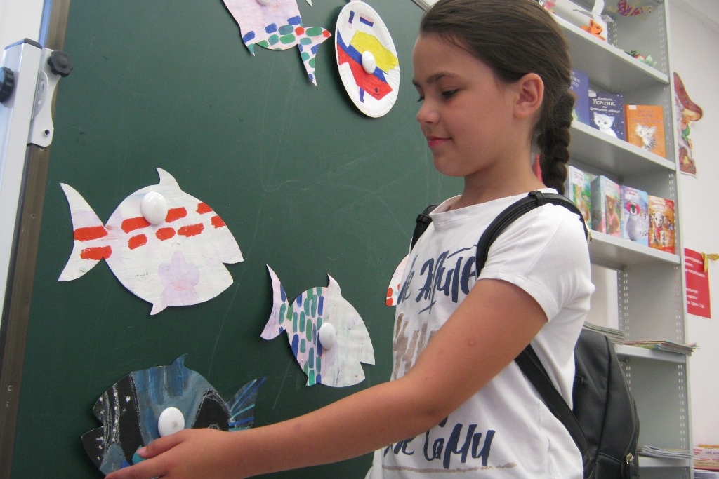 Между прочим, не все поделки с творческих мастерских уносятся по домам, часть остается в библиотеке и не стоит без дела. Так, в преддверии дня ВМФ, каждого посетителя детского абонемента ждала викторина из вопросов по книге В. Некрасова «Приключения капитана Врунгеля». При каждом верном ответе читатель мог подойти к доске с импровизированным косяком рыб и помочь бумажной рыбе спуститься с поверхности в морскую глубину. Бумажные разноцветные рыбы как раз остались от прошлых творческих мастерских, причем раскрашивать поделку рекомендовалось в духе абстракции Мондриана, Ротко или Яеи Кусама, на выбор.