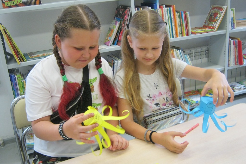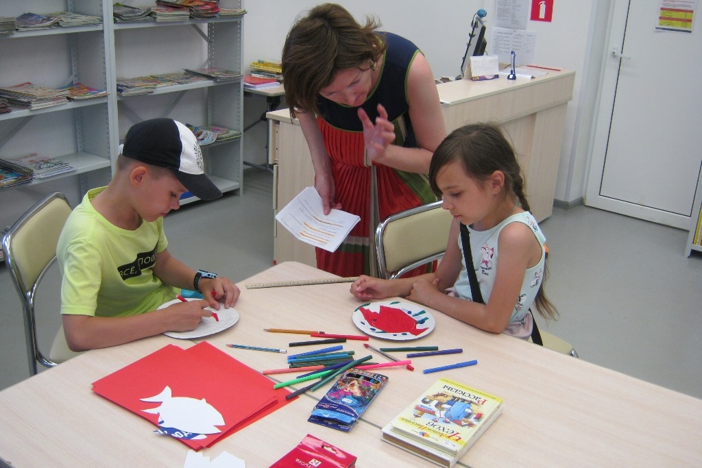 Между прочим, не все поделки с творческих мастерских уносятся по домам, часть остается в библиотеке и не стоит без дела. Так, в преддверии дня ВМФ, каждого посетителя детского абонемента ждала викторина из вопросов по книге В. Некрасова «Приключения капитана Врунгеля». При каждом верном ответе читатель мог подойти к доске с импровизированным косяком рыб и помочь бумажной рыбе спуститься с поверхности в морскую глубину. Бумажные разноцветные рыбы как раз остались от прошлых творческих мастерских, причем раскрашивать поделку рекомендовалось в духе абстракции Мондриана, Ротко или Яеи Кусама, на выбор.