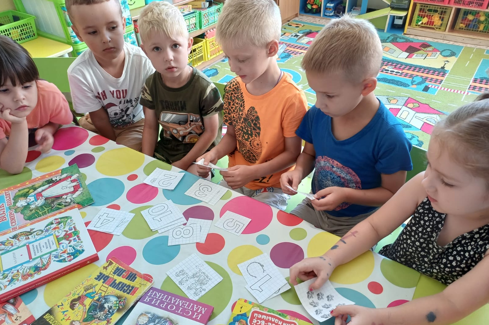 Дети принимали участие в различных играх, которые были связаны с математикой. Нужно было распределить цифры с карточками, на которых изображены различное количество предметов. Они учились считать, распознавать цвета и формы, развивали свою мелкую моторику и координацию движений.