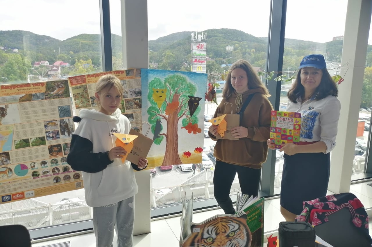 Дети постарше и подростки писали пожелания тигру, всем животным и растениям на листьях деревьев, изготовленных из бумаги, и приклеивали их на бумажное дерево (дуб), выражая при этом свою доброту и заботу. Дети подходили к нашему дубу, выбирали понравившуюся птицу(филин, ушастая сова, ворона, ежик)знакомились с техникой оригами(книгаи делали на цветной бумаги понравившуюся птицу. По ходу поделки слушали информацию о совах и вообще о том, почему птицы летают и не падают. Своим птичкам дети давали имена, подходили опять к плакату с деревом и придумывали истории, связанные с их птичками, ребята постарше оставили на дубовых листьях пожелания библиотекам.