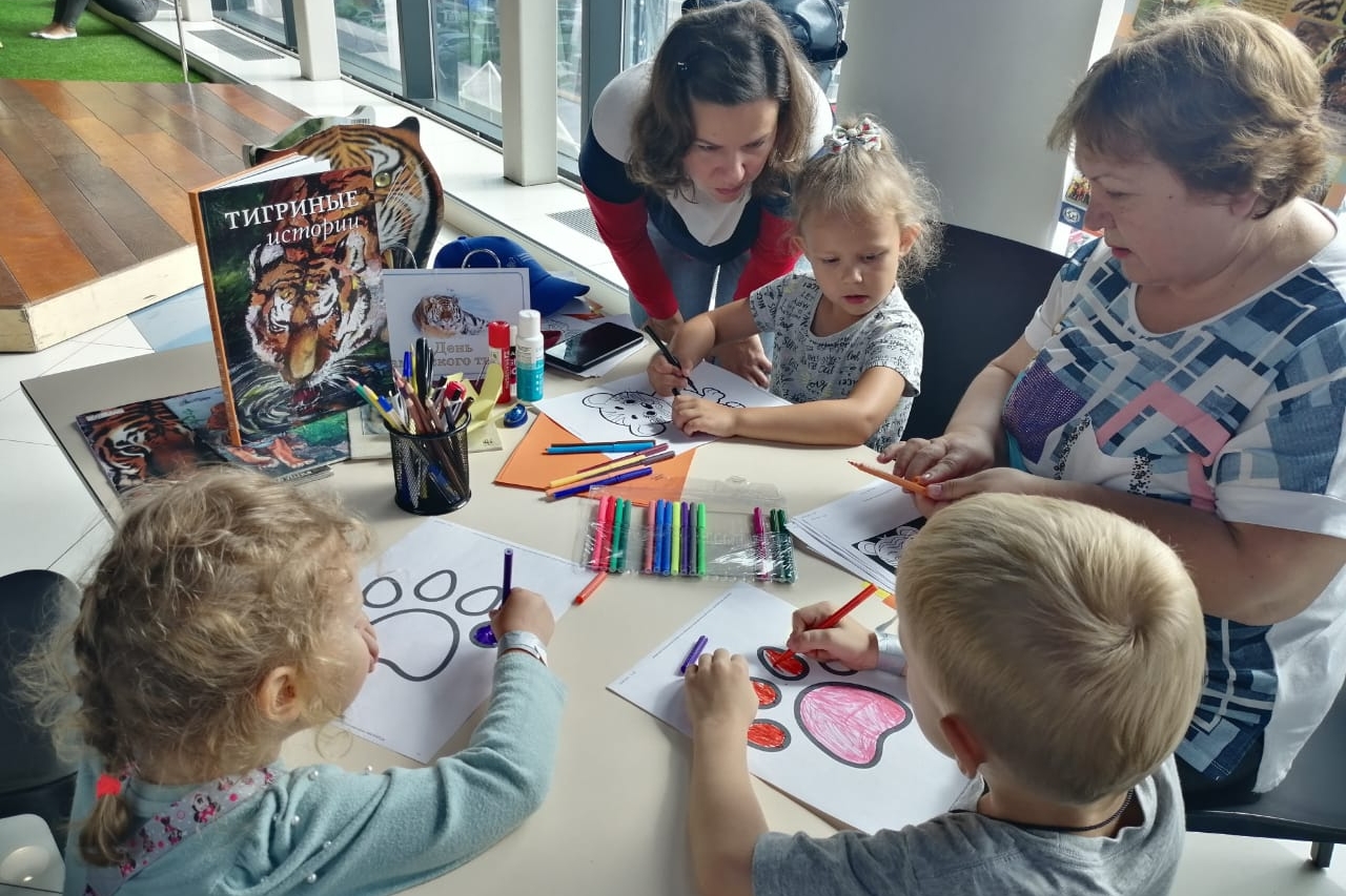 Маленьким детям было предложено разукрасить тигриные рисунки. Большинству участников было от 5 до 12 лет. И они с восторгом рассказывали, что уже знают о тиграх, книжках и слушали новые истории.