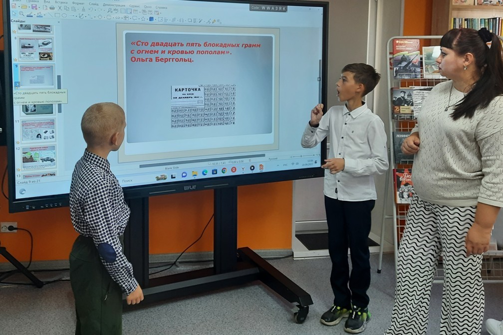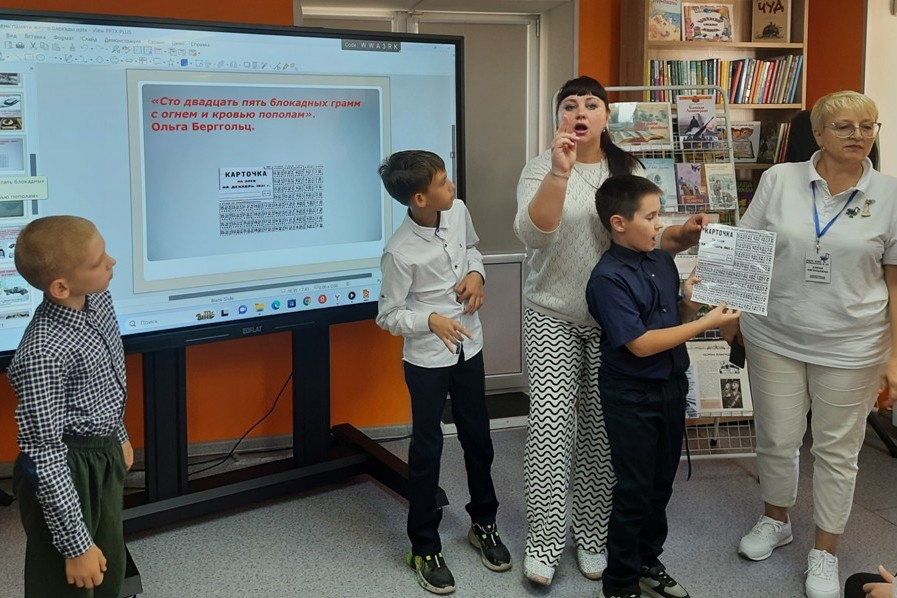 Библиотекари рассказали школьникам о том, что 82 года назад, 8 сентября 1941 года, вокруг Ленинграда, нынешнего Санкт-Петербурга, замкнулось вражеское кольцо блокады. Блокада Ленинграда — одно из самых трагических событий Великой Отечественной войны 1941-1945 годов. С этого дня началась 900-дневная осада города, которая потребовала напряжения всех моральных и физических сил его защитников Ребятам были показаны анимационный фильм «Корочка хлеба» от проекта ЖИТЬ об истории одной ленинградской девочки, художественную картину «Блокадные рецепты» (реж. Фёдор Бабенко) о рационе жителей блокадного Ленинграда. 900 дней и ночей жители осаждённого города жили, работали, сражались, выстояли и победили. За массовый героизм и мужество, проявленные защитниками блокадного Ленинграда, городу присвоена высшая степень отличия — звание Город-герой.