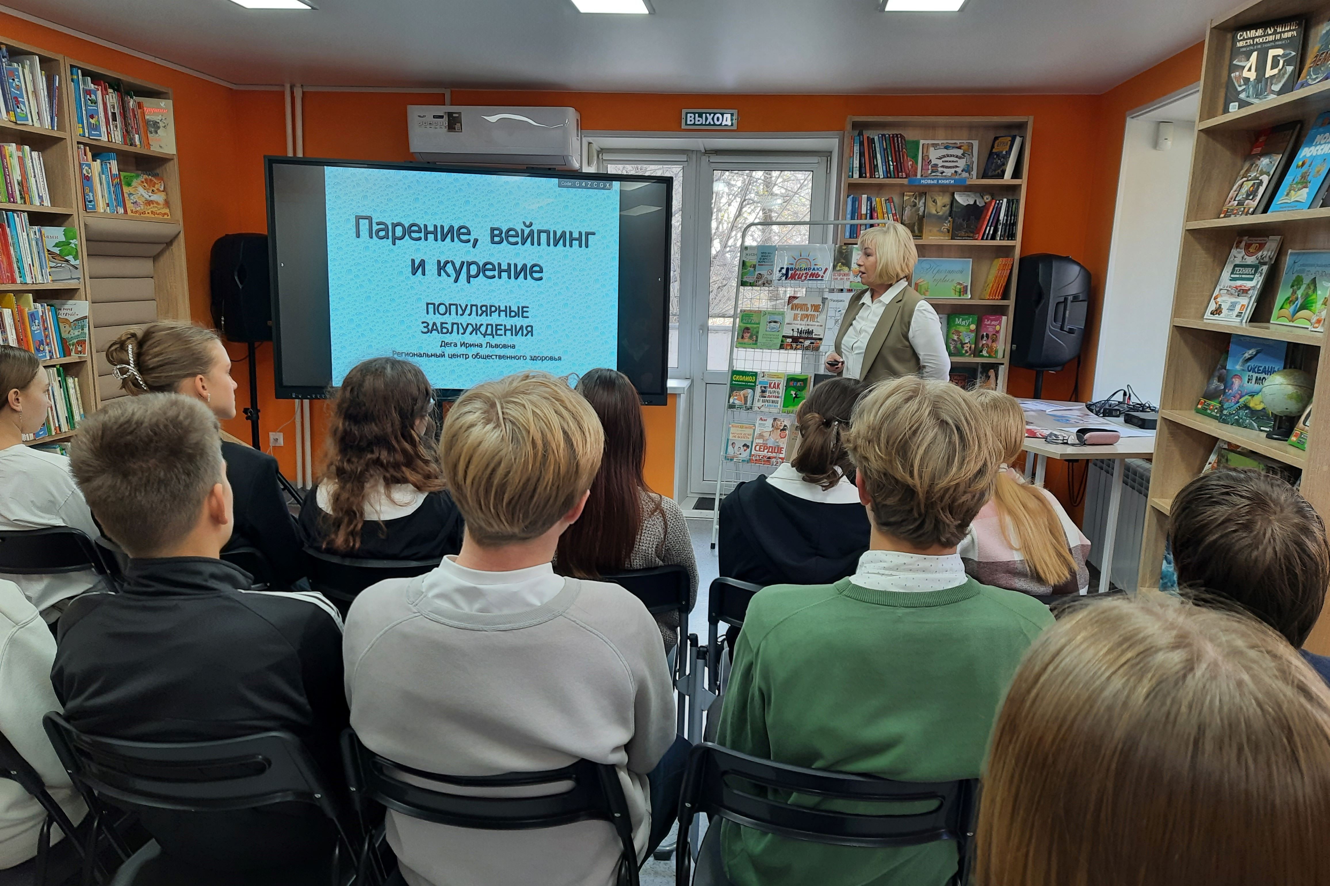 Профилактическую беседу-тренинг «Твое здоровье – в твоих руках» для подростков из 58 школы провела Дега Ирина Львовна, зав. отделом организации медицинской профилактики. Ирина Львовна подготовила для восьмиклассников презентацию «Вейпинг: популярные заблуждения». Согласно исследованиям, увеличилось общее количество курильщиков, которые впоследствии возвращаются или переходят на сигареты, а также увеличилось количество курящих детей. Всё чаще на улицах мы видим людей, курящих электронные сигареты и вейпы.