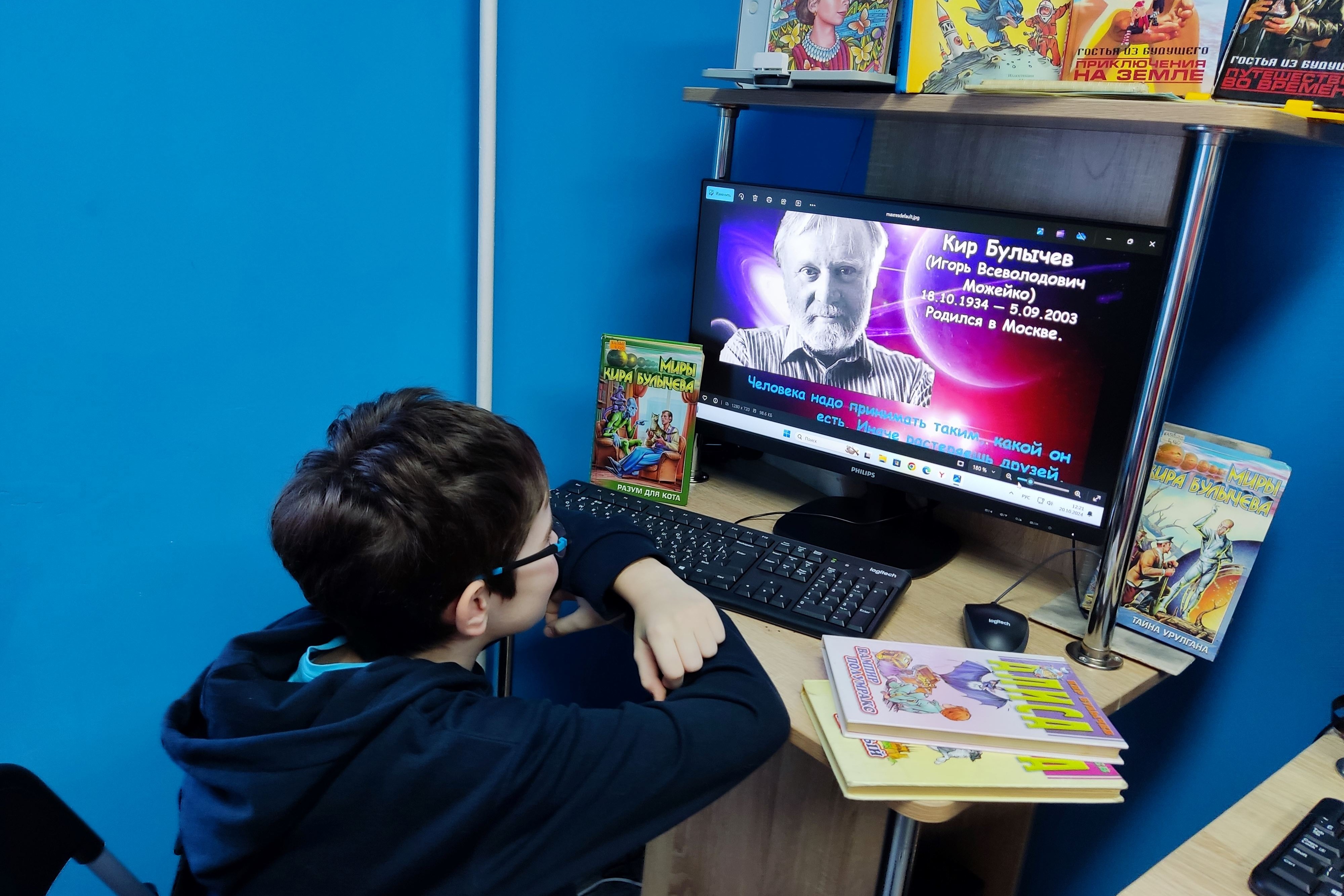 В библиотеке № 20 для читателей организована виртуальная выставка «Писатель, заглянувший в будущее». Кир Булычев является одним из самых популярных советских фантастов. Читатели знакомились с произведениями автора, которые есть в фонде библиотеки. Это – легкая и увлекательная фантастика, обладающая отличным юмором, захватывающим сюжетом и непредвиденной концовкой. Герои повестей Булычева, нередко путешествуя по просторам космоса и другим планетам, встречаются с инопланетянами, попадают в прошлое или будущее, знакомятся с другими мирами.