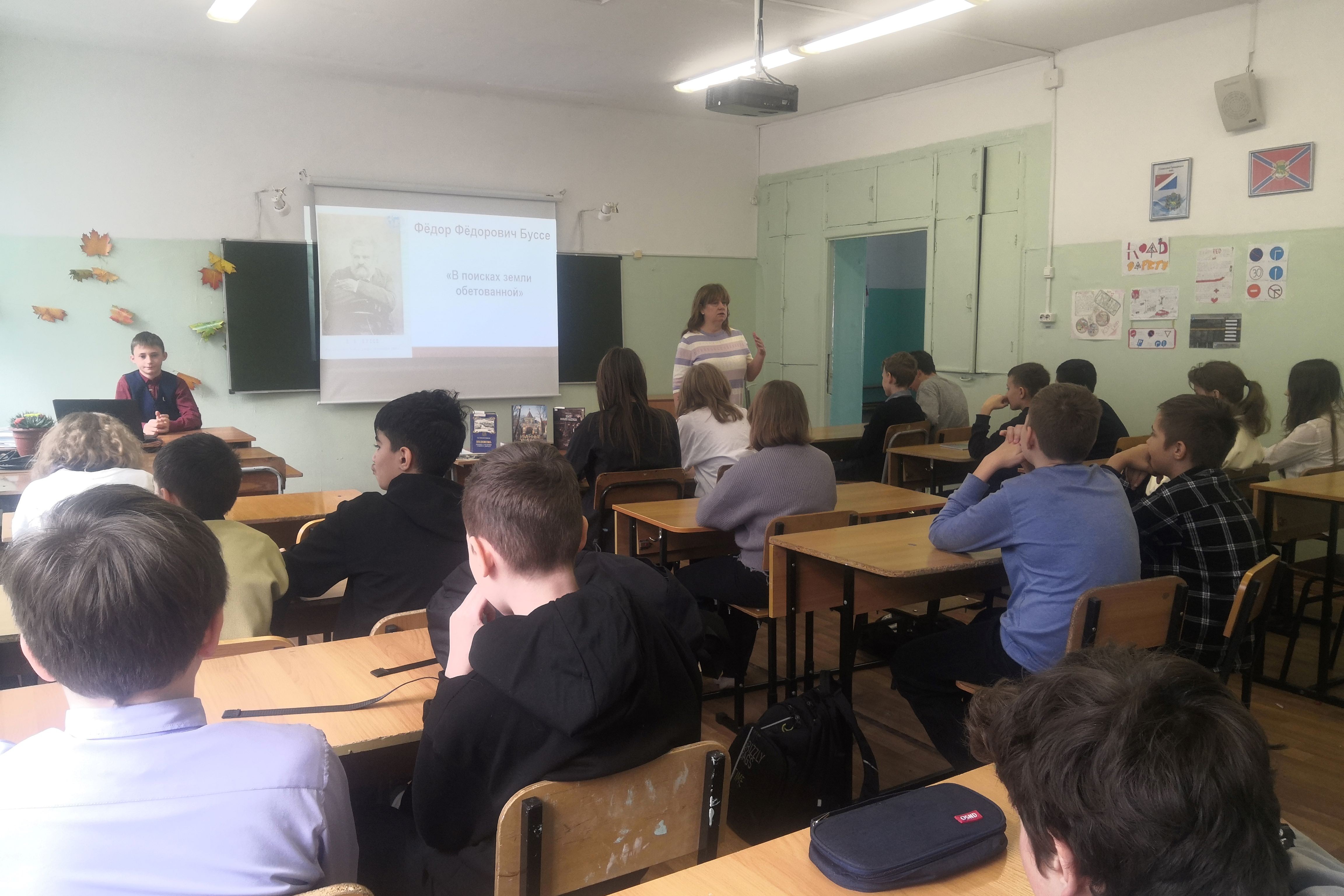 Для учащихся 7 А и 7 Б классов СОШ №43 библиотека №16 провела краеведческий урок «В поисках обетованной земли» в рамках проекта «Знаменитые семьи Владивостока и Приморского края». Ребятам рассказали о человеке, благодаря которому переселенцы на нашей земле обрели дом. Это Федор Буссе.