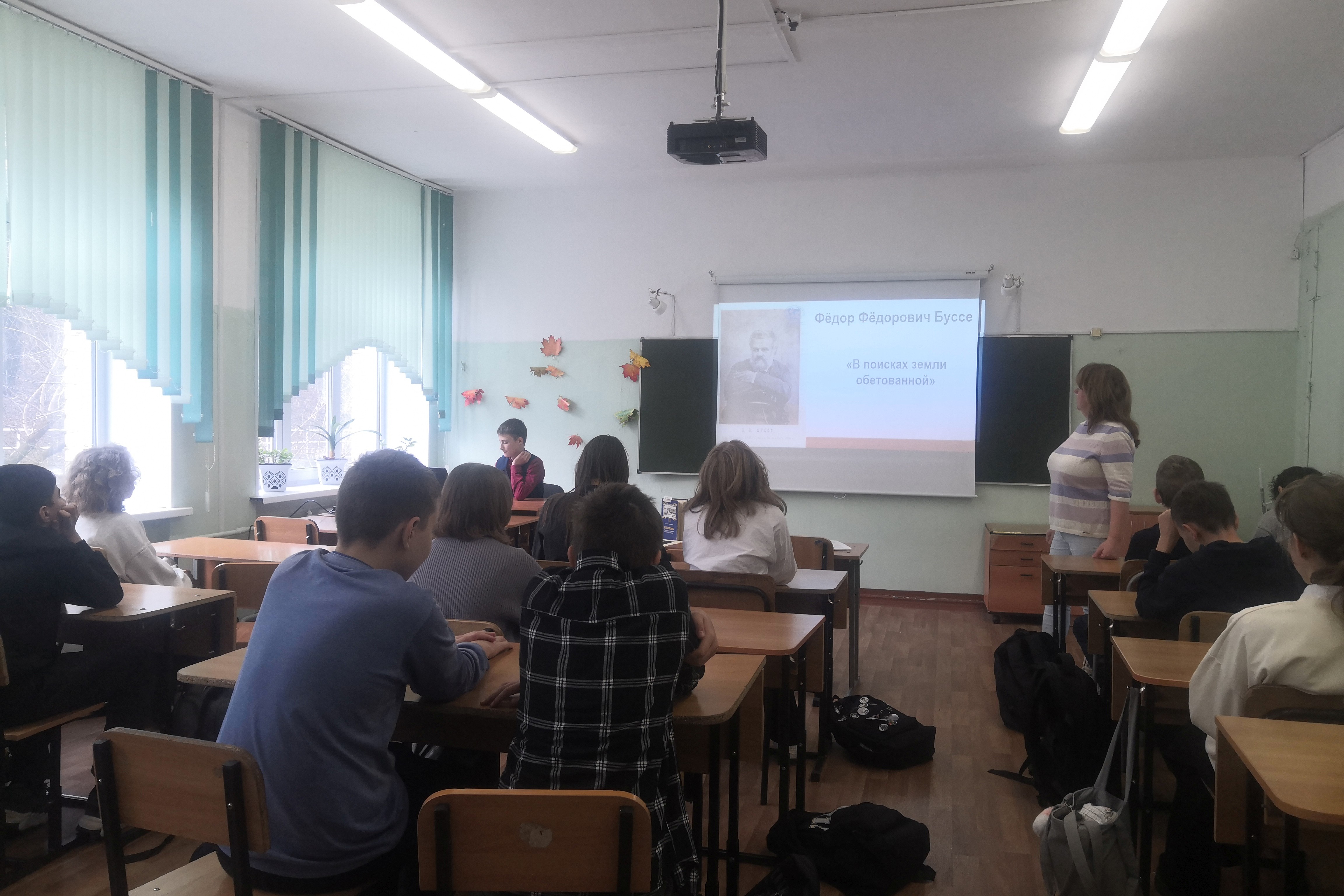Ребята узнали о том, что Федор Буссе родился в Санкт-Петербурге в семье известного педагога, ученика И. Песталоцци, автора учебников по математике, директора 3-й Санкт-Петербургской гимназии, Федора Ивановича Буссе. Окончил физико-математический факультет Санкт-Петербургского университета. С декабря 1861 был принят, по рекомендации двоюродного брата Николая Васильевича Буссе, на должность чиновника по особым поручениям в Главном Управлении Восточной Сибири.