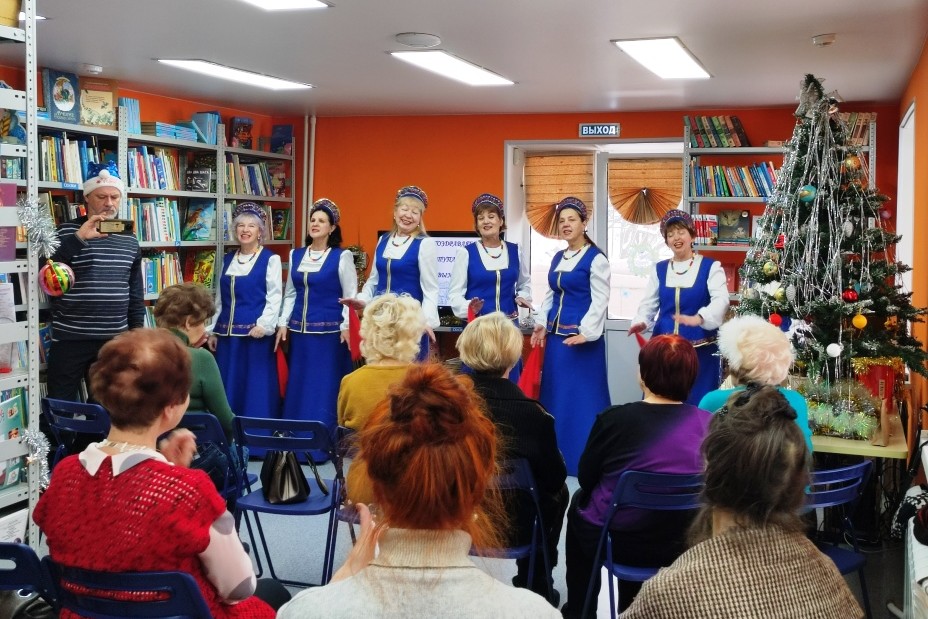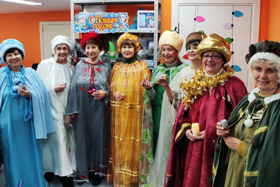 Гости с удовольствием исполнили любимую песню детства, причем, ее полную версию. «Серебряные» педагоги Советского района вновь подготовили костюмированное новогоднее представление, стихи и костюмы для которого также написала и сшила Людмила Николаевна Уманская. Замечательным продолжением вечера стало выступление вокальной группы «Чайка» хора «Надежда» Дворца культуры железнодорожников. В их исполнении прозвучали новогодние песни советских лет.