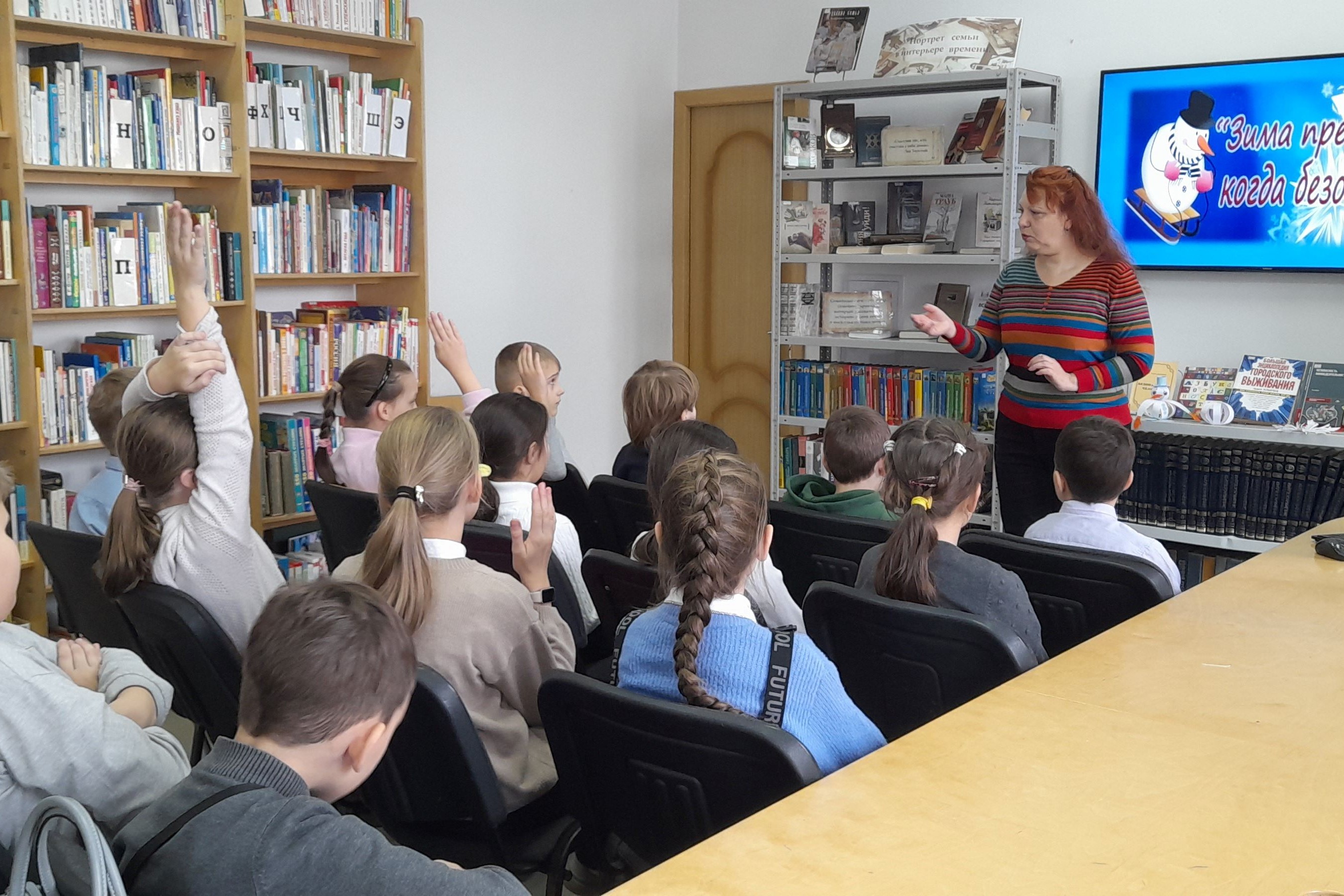 Зима — чудесная, волшебная пора, очень красивое время года. Зимние развлечения любят и дети, и взрослые: катание на коньках, с горки на санках, лыжные прогулки по заснеженному лесу, можно слепить снежную бабу и поиграть в снежки. Зима для многих самое любимое время года, но и самое холодное. Однако, зимние прогулки и развлечения на улице, на природе таят определённые опасности. Сотрудники библиотеки № 16 и учащиеся 3 «Б» класса СОШ № 43 размышляли как обезопасить себя от опасностей, которые преподносит зимний период времени года. Библиотекари, в рамках акции «Безопасность детства» рассказали ребятам о правилах поведения на льду, на катке, на водоемах, на горках, на дорогах. Ребята сыграли в игру «Как одеться зимой, чтобы дед Мороз не схватил за нос», — как одеваться при холодной погоде, выяснив почему нужно носить зимой шапку и рукавицы.