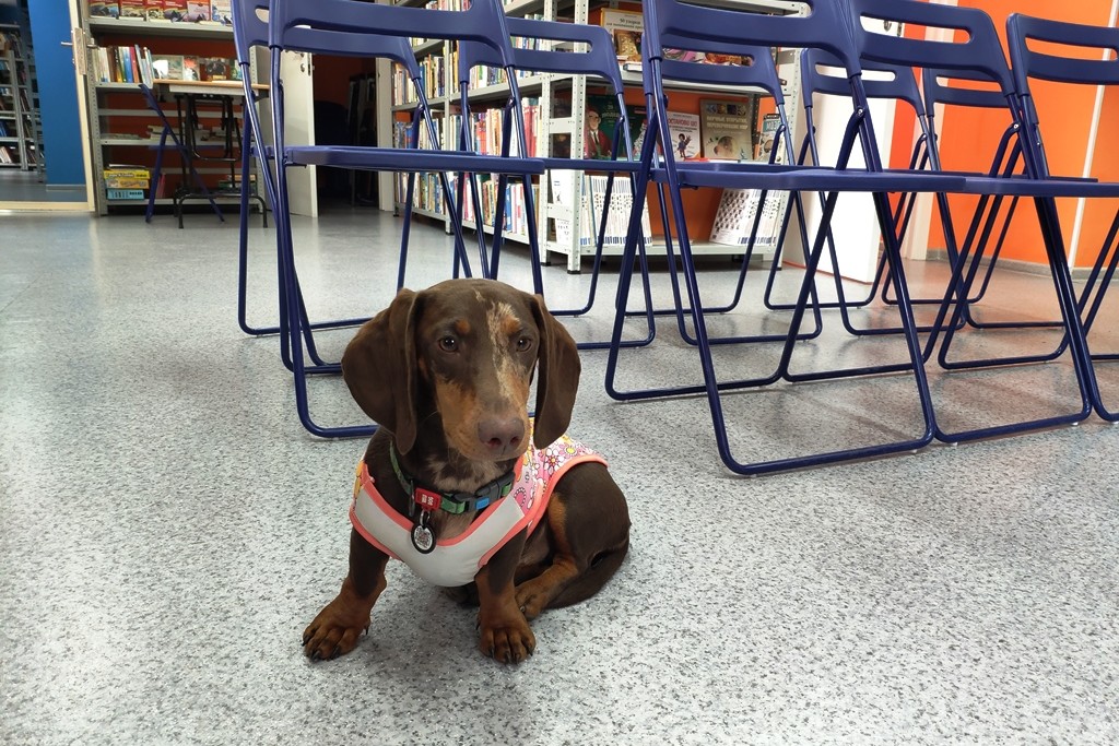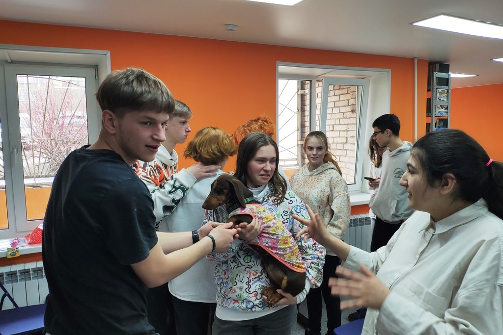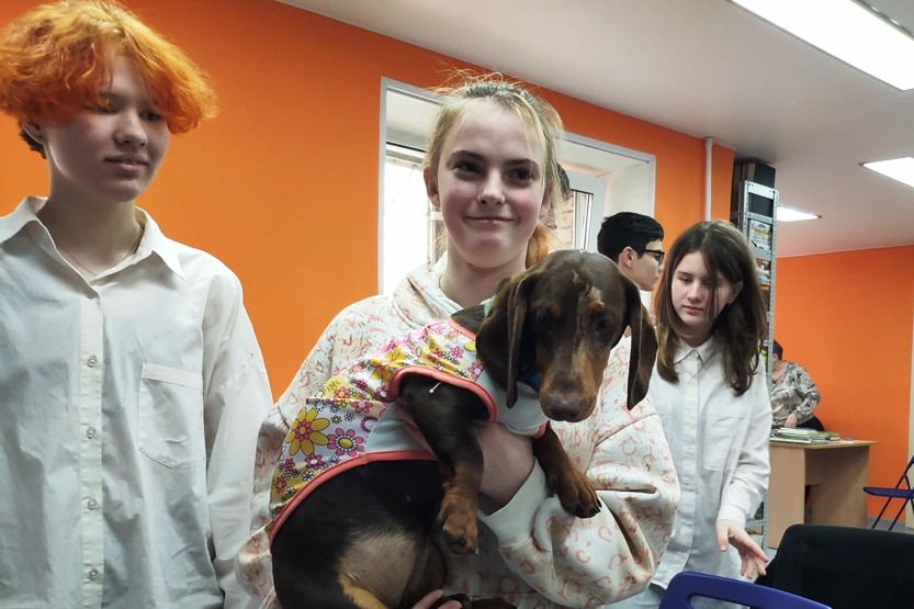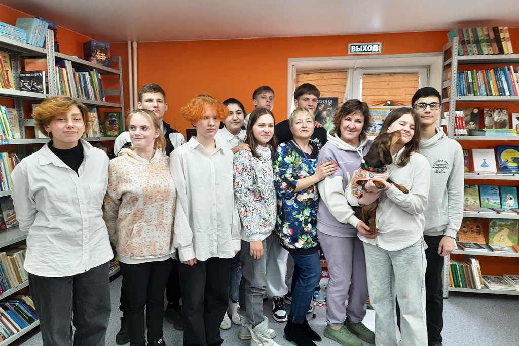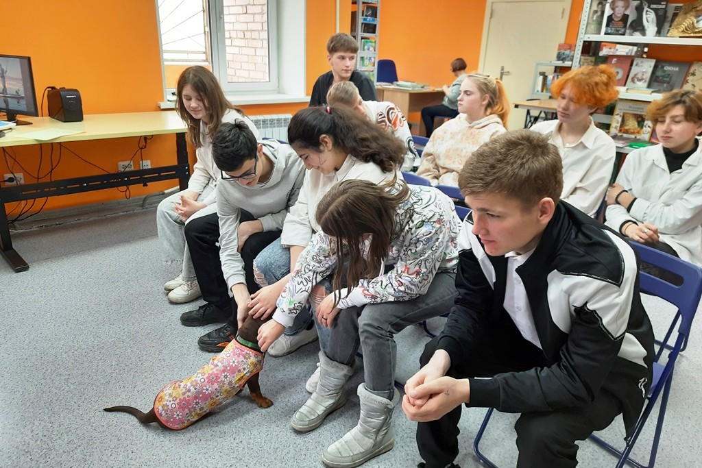 Неожиданным и приятным сюрпризом для ребят стало появление в библиотеке Алены Саитовой, сап-спортсмена, блогера и ее щенка гладкошерстной таксы по кличке Теккелс мэджик Шанди, или просто Саньки. Алена показала фотографии и видеосюжеты из жизни шестимесячного задорного щенка, рассказала о том, что с появлением четвероногого малыша жизнь всей семьи, распорядок дня меняется: составляется график кормления, прививок, развлечений, прогулок. У Алены двое питомцев и оба породы такса, старший – 9-летний Мускат, «ведет» свой блог https://t.me/muskatdog. Многие ребята сразу же подписались на него. А гуляют наши друзья не только во дворе, но и в необыкновенно красивых местах, ведь у них есть сап. И обе собаки бесстрашно выходят вместе с Аленой в море, путешествуют и даже участвуют в знаменитом угоне льдины. Шанди – Саня – очень общительный щенок, с удовольствием играла со всеми, даже показала, какие команды уже умеет выполнять, а в конце встречи приняла участие в совместной фотосессии.