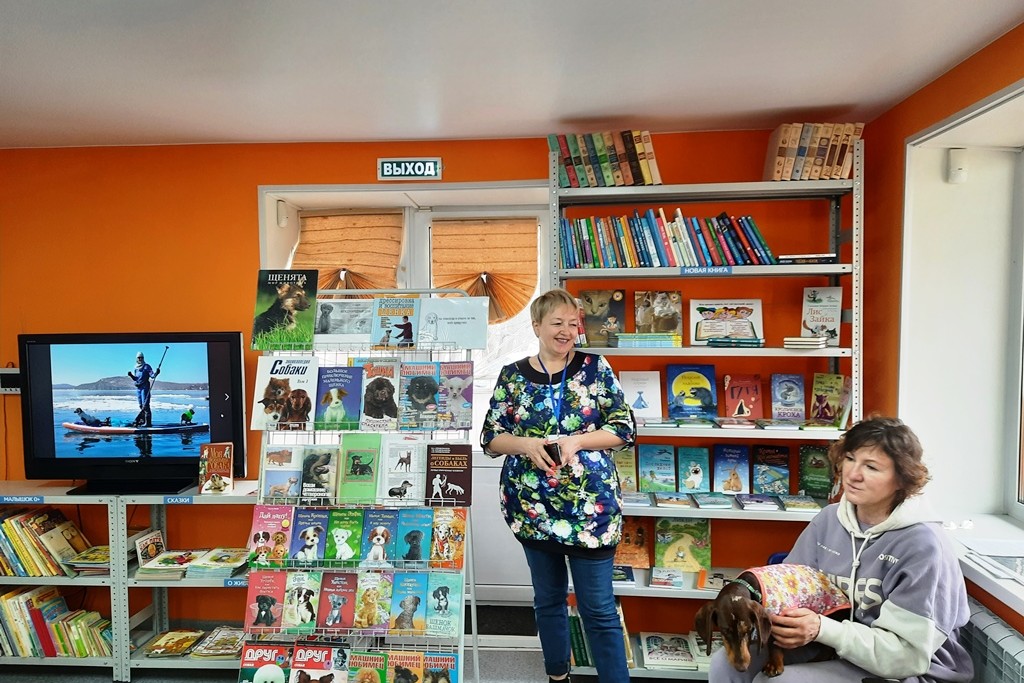 Неожиданным и приятным сюрпризом для ребят стало появление в библиотеке Алены Саитовой, сап-спортсмена, блогера и ее щенка гладкошерстной таксы по кличке Теккелс мэджик Шанди, или просто Саньки. Алена показала фотографии и видеосюжеты из жизни шестимесячного задорного щенка, рассказала о том, что с появлением четвероногого малыша жизнь всей семьи, распорядок дня меняется: составляется график кормления, прививок, развлечений, прогулок. У Алены двое питомцев и оба породы такса, старший – 9-летний Мускат, «ведет» свой блог https://t.me/muskatdog. Многие ребята сразу же подписались на него. А гуляют наши друзья не только во дворе, но и в необыкновенно красивых местах, ведь у них есть сап. И обе собаки бесстрашно выходят вместе с Аленой в море, путешествуют и даже участвуют в знаменитом угоне льдины. Шанди – Саня – очень общительный щенок, с удовольствием играла со всеми, даже показала, какие команды уже умеет выполнять, а в конце встречи приняла участие в совместной фотосессии.