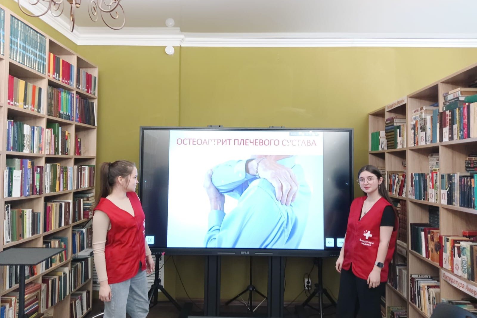 12 марта в библиотеке № 4 для читателей состоялась вторая профилактическая беседа «Здоровье суставов в надёжных руках», которую провели волонтёры-медики из ТГМУ. В рамках Всероссийской социально-профилактической программы «Здоровые суставы в надёжных руках» волонтёры проинформировали присутствующих о причинах и признаках дегенеративных заболеваний суставов, способах профилактики и сохранения подвижности наших суставов. Волонтёры-медики рассказали о том, что способствует появлению болей в спине, появление остеоартрита. Вторая часть встречи — это практический мастер-класс «Зарядка для сохранения подвижности суставов». Волонтёры — медики убедительно рекомендовали двигаться, отдыхать и питаться правильно. Разрушение суставов- это необратимый процесс, поэтому гораздо легче предотвратить заболевания, чем лечить уже запущенные стадии. Участники встречи остались благодарны волонтёрам, студентам ТГМУ, будущих врачей-педиатров.