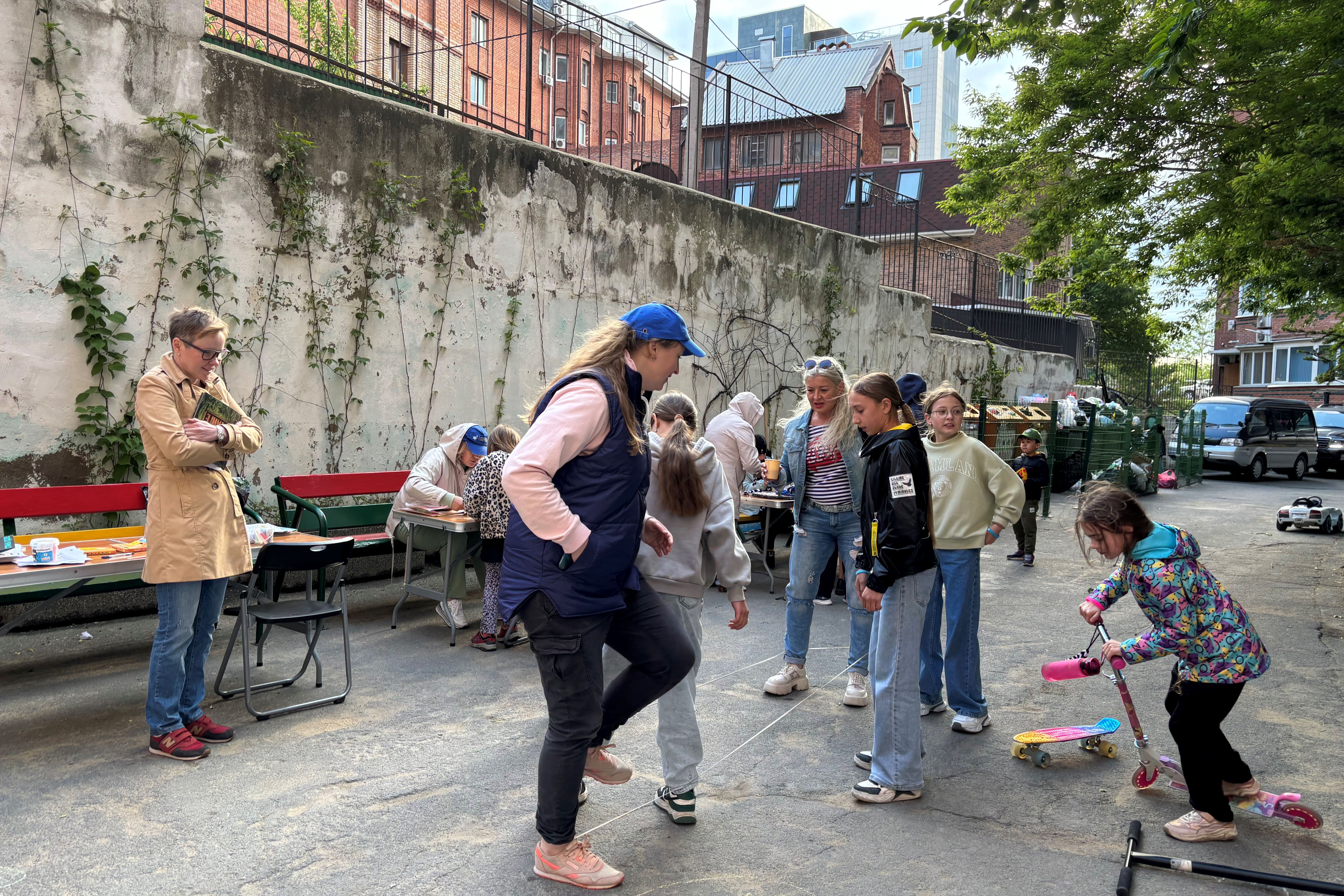 На благоустроенной площадке дома в празднике соседей приняли участие и сотрудники Владивостокской централизованной библиотечной системы. Дети сразу обратили внимание на солнечное местечко, где работала площадка. Вначале занимались творчеством – мастерили интересные поделки из бумаги, раскрашивали, отгадывали филворды, загадки на знание сказок, знакомились с интересными и необычными интерактивными книгами, увидев их в действии. Родители многих детей тоже участвовали в совместном творчестве и чтении. Они прислушивались к советам библиотекарей, что почитать детям летом, где взять книги, как работают библиотеки летом, что интересного можно там делать в свободное время, поэтому им была интересна информация о программе «Лето просвещения».