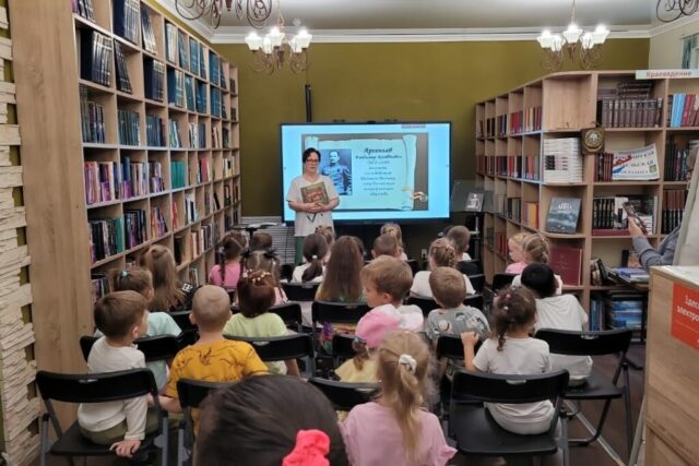 И библиотека № 21 (ул. Нейбута, 45) провела мероприятие для дошколят из детского сада № 140. Дети узнали о том, как Дерсу Узала делился своими знаниями о природе, учил Арсеньева читать следы животных, находить дорогу в густом лесу и выживать в экстремальных условиях. Юные слушатели с интересом узнали о битве пчёл и муравьёв за мед из рассказа «Пчелы и муравьи», о настойчивом мишке в рассказе «Лесной лакомка», который всеми силами пытался добыть главную сладость в лесу, а также о других обитателях тайги. После прочтения дети с удовольствием прокомментировали поступки животных и поделились своими знаниями о таежной фауне. Главным открытием для ребят стало переиздание рассказов Арсеньева «Встречи в тайге» с удивительной технологией дополненной реальности. Интерактивный формат издания поразил воображение детей, которые с восторгом наблюдали, как на экранах гаджетов оживали иллюстрации: охота ястреба, который не мог утащить тяжелого зайца, рыбалку рыбного филина и другие удивительные моменты из жизни тайги. После веселой викторины участники встречи поделились своими впечатлениями об услышанном.