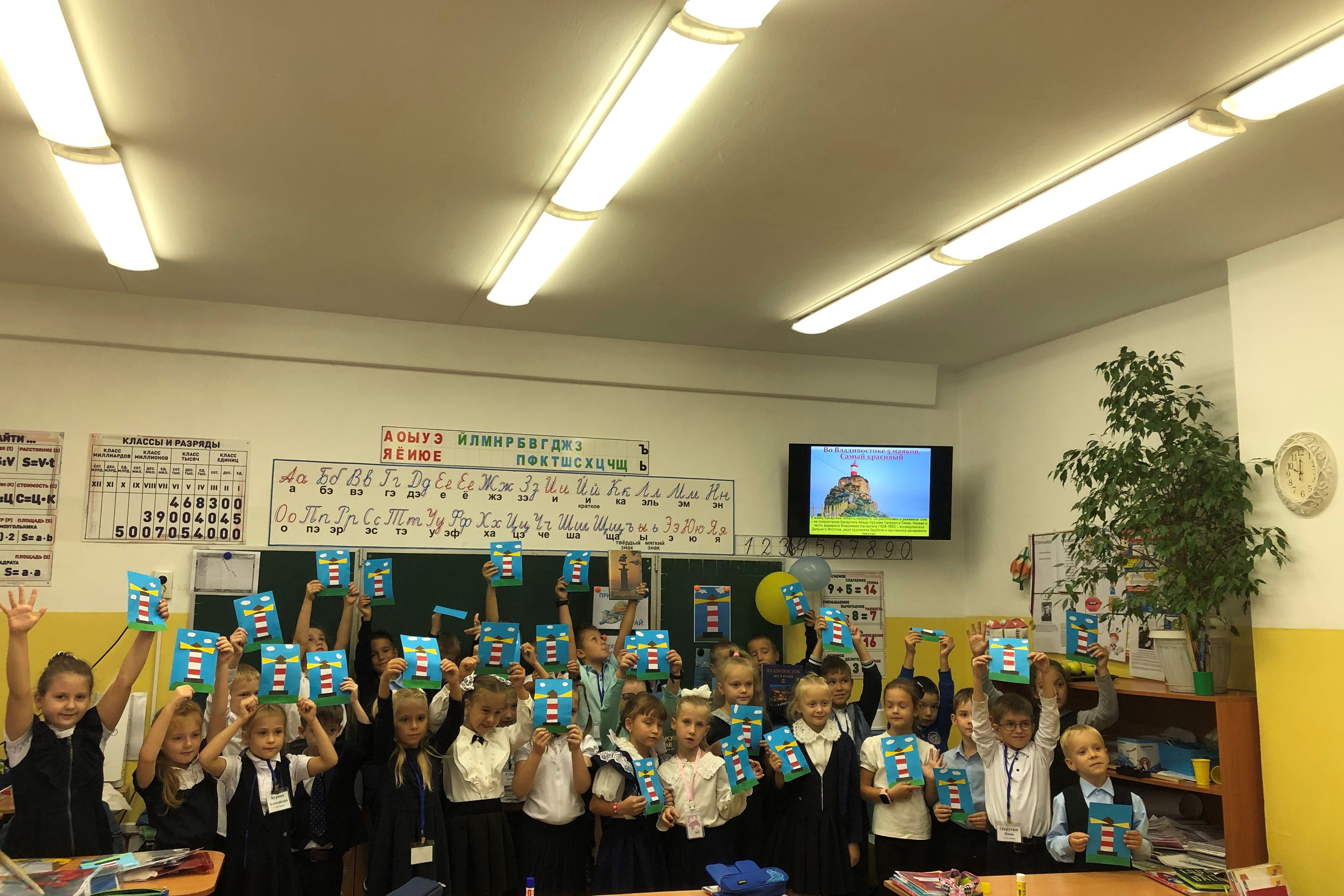 Занятие продолжилось рассказом о родном городе, иллюстрированном фотографиями. Школьники познакомились с памятными местами и неофициальными символами Владивостока, в том числе и с маяками, которые не только указывают безопасный путь кораблям, но и являются символом морской романтики и приключений, а два маяка – Скрыплёва и Басаргина – называют морскими воротами Владивостока.