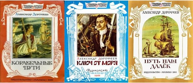 Так издательство «Малыш» в 1988 и 1989 гг. выпустило первые две части будущей трилогии о Петре I и создании флота под авторством Александра Дорофеева – «Ключ от моря» и «Корабельные пути», проиллюстрированные художником Сергеем Бордюгом. Немногим позже в 1991 году была опубликована заключительная часть трилогии – «Путь наш далек».