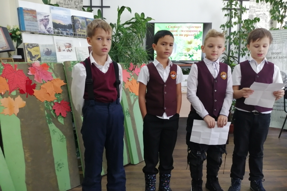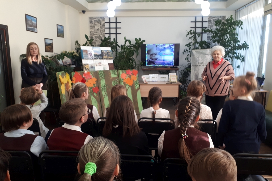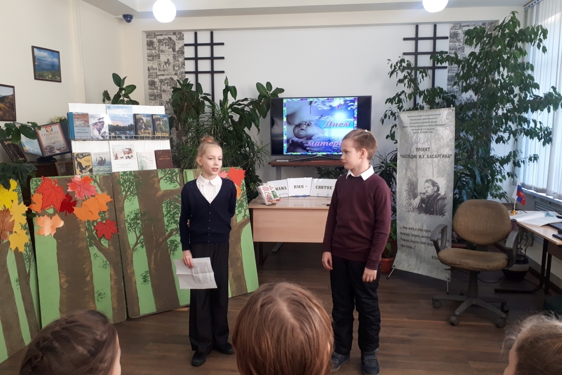 24 -25 ноября в библиотеке им. И. Басаргина для 3«Б» и 4 «Б» классов школы № 57 прозвучала поэтическая композиция «Спасибо тебе, родная!» по программе литературного лицея «Юный родовед». Ведущие Алина Моисеева и Дима Пляскин в поэтической форме рассказали о празднике «День матери». «Как сияющее солнце, согревает всё живое, так и мама своей любовью греет ребёнка». Диана Шергина выразительно прочитала стихотворение «О доброте».