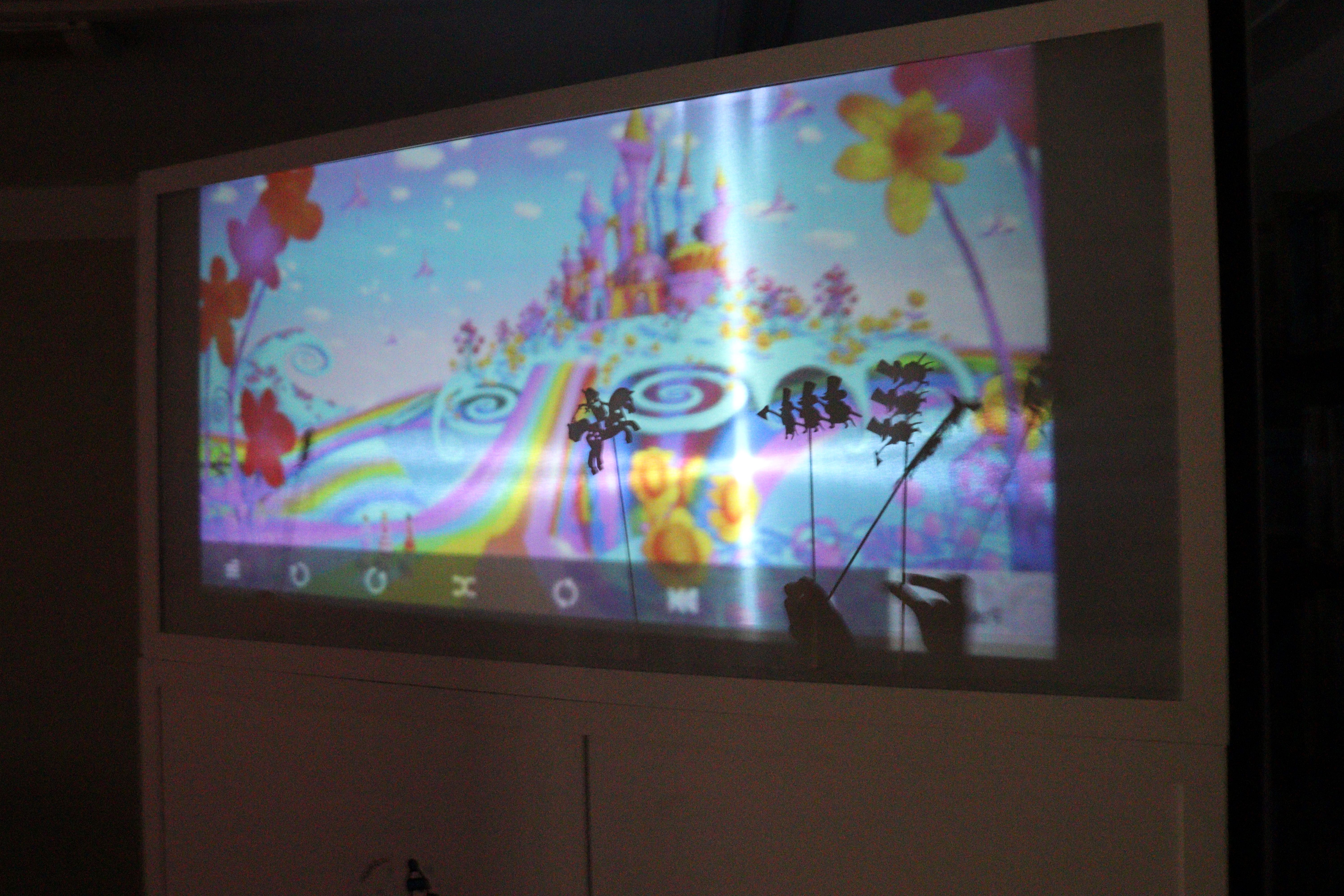 После ребята включились в процесс приготовления бумажных марионеток для теневого театра. И вот когда актёры были готовы, проектор настроен, а дети ожидали, когда уже можно самостоятельно управлять своими персонажами, началась сказка. Совсем не просто играть Мышильду – королеву мышей или принцессу Пирлипат, но зато так увлекательно!