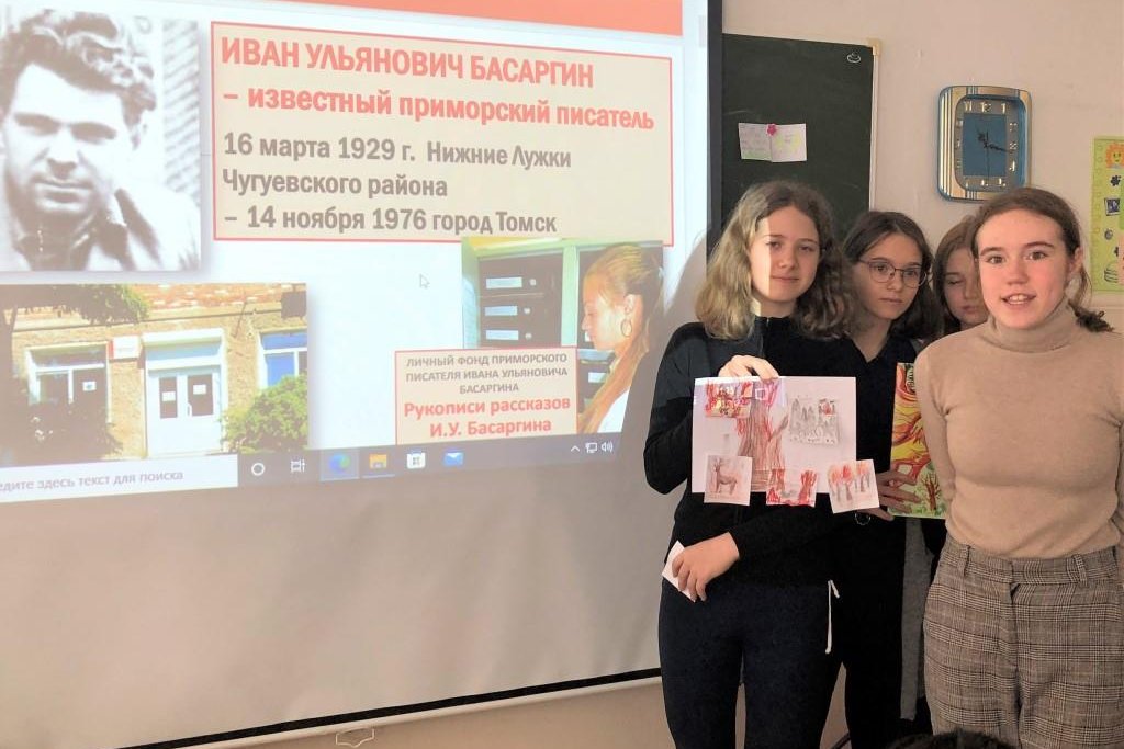 Старшеклассники, которые уже несколько лет занимаются по программе «Басаргинская строка», подготовили сообщения о творчестве писателя, его сложном жизненном пути, отметили, что некоторые факты биографии встречаются на страницах его рассказов и новелл. Обратили внимание на то, что язык Басаргина редкий, своеобразный, достался ему в наследие от предков – потомственных тайгарей, отличается авторской индивидуальностью, индивидуальным стилем. И.У. Басаргин родился в маленьком таежном селении, и картины «милой таежной родины» дороже и ближе которой для него не было, он рисует во многих произведениях. Крупные произведения автора (романы «В горах Тигровых», «Дикие пчелы», «Распутье») повествуют о жизни нескольких прошедших поколений; повести, рассказы и очерки (например, «Репортаж из тайги», «Акимыч – таежный человек») – тревожат души читателей, передают человеческую, гражданскую боль за тайгу, за уничтожение ее человеком.
