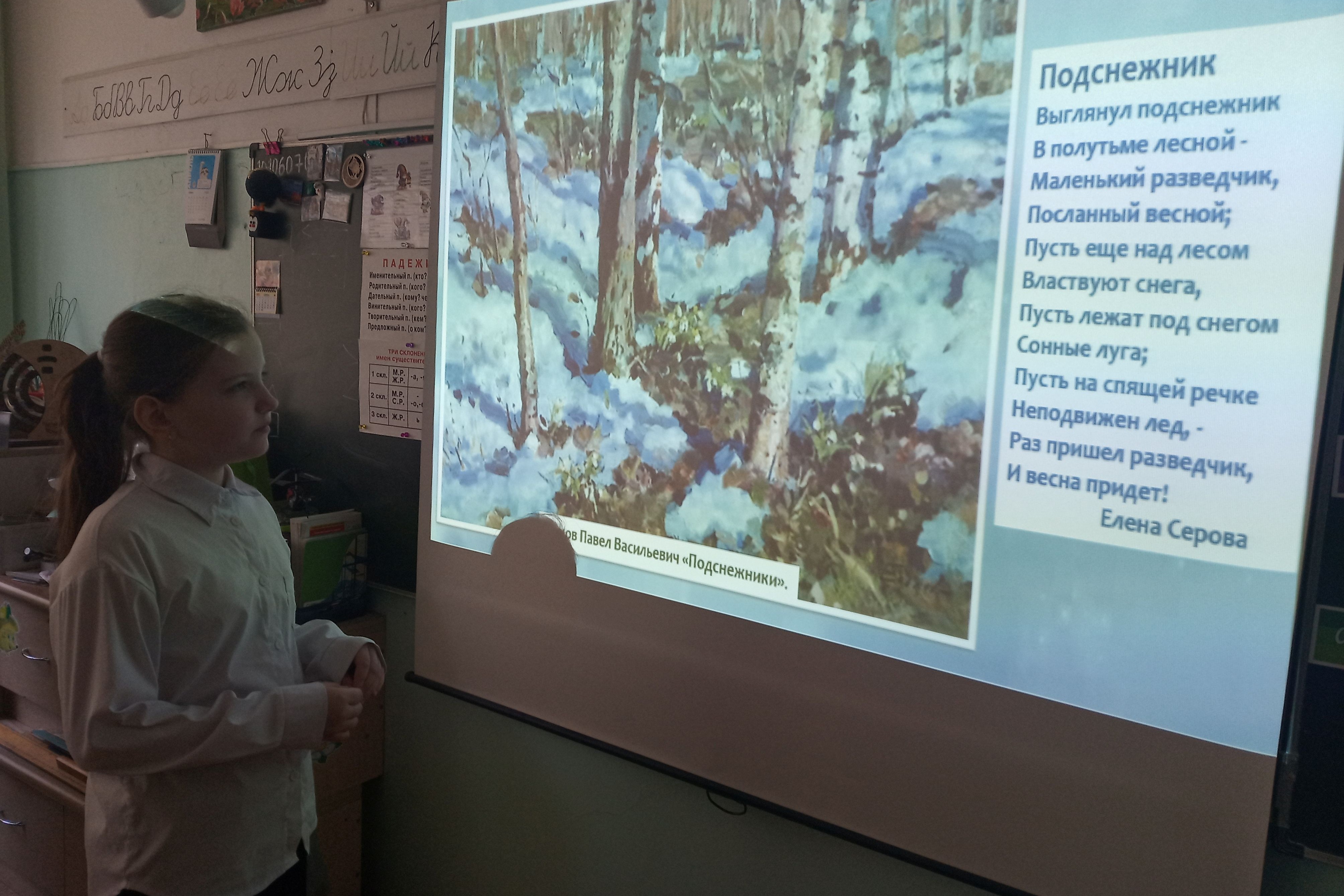 Не могли обойти своим вниманием эти нежные цветы художники, поэты и писатели. О подснежниках написано много прекрасных строк. Используя презентацию, подготовленную библиотекарем, ребята рассматривали репродукции картин, читали стихи, посвященные «храброму» цветку весны. Ребята вспомнили стихотворение Тимофея Белозерова «Подснежники» и прочитали его наизусть.