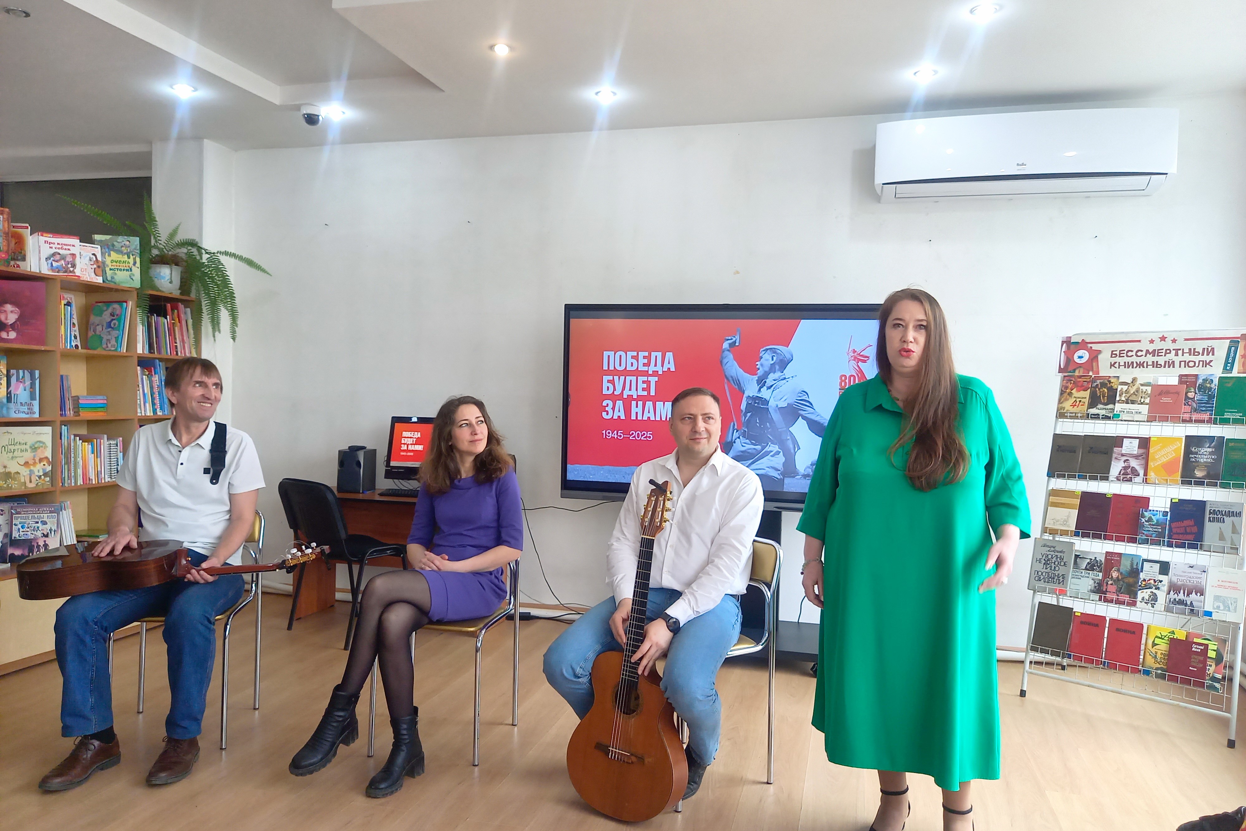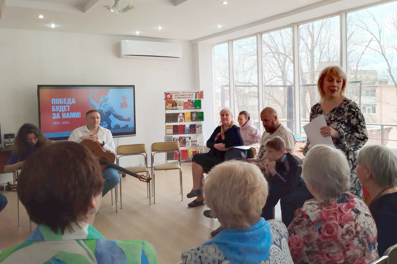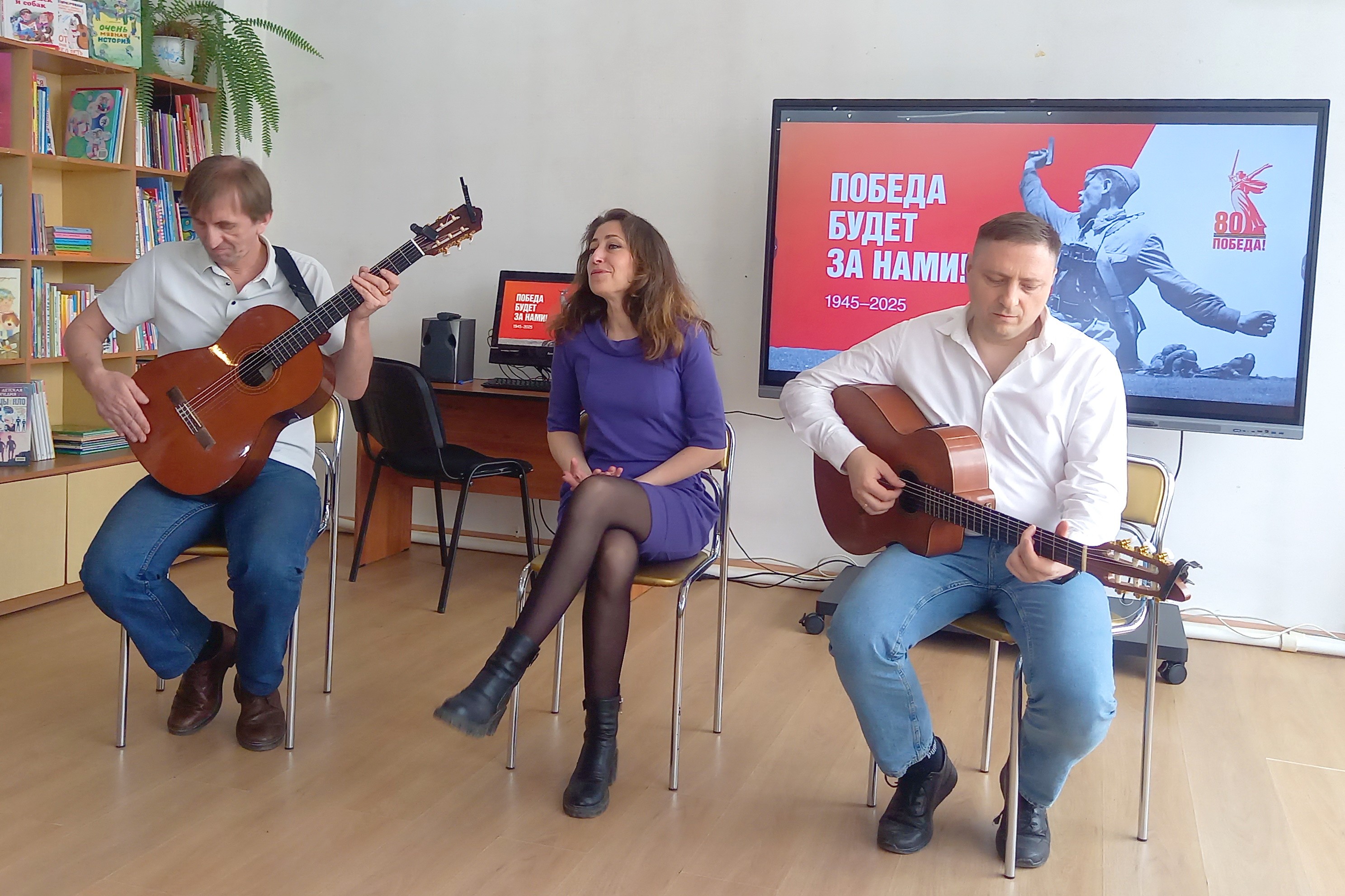 Программа Всероссийской акции «Библионочь-2025» в библиотеке № 3 (ул. Хабаровская, 19) объединяла музыку, поэзию и песню. Литературно-музыкальная программа «Опять весна на белом свете!» собрала в один дружный круг и участников и зрителей. У каждого была возможность прозвучать: прочесть стихотворение, спеть песню вместе со всеми. Мероприятие стало посвящением Великой Победе, Весне, Любви и Миру. Музыкальную атмосферу встречи создал ансамбль «Ключ» – яркий представитель дальневосточной авторской песни: Геннадия Зубрия, Алексея Потапова и Олеси Потаповой. Звучали песни Булата Окуджавы и сильные духом песни Великой Отечественной.