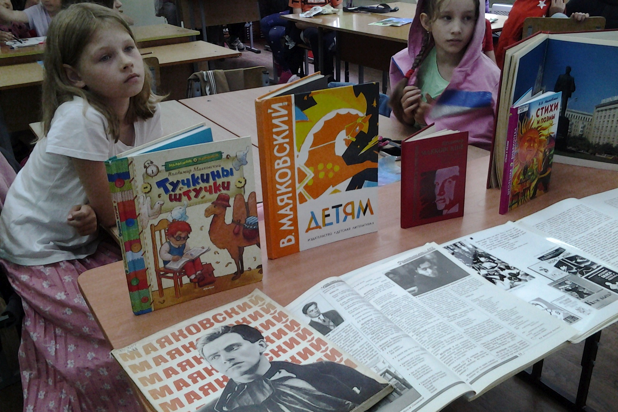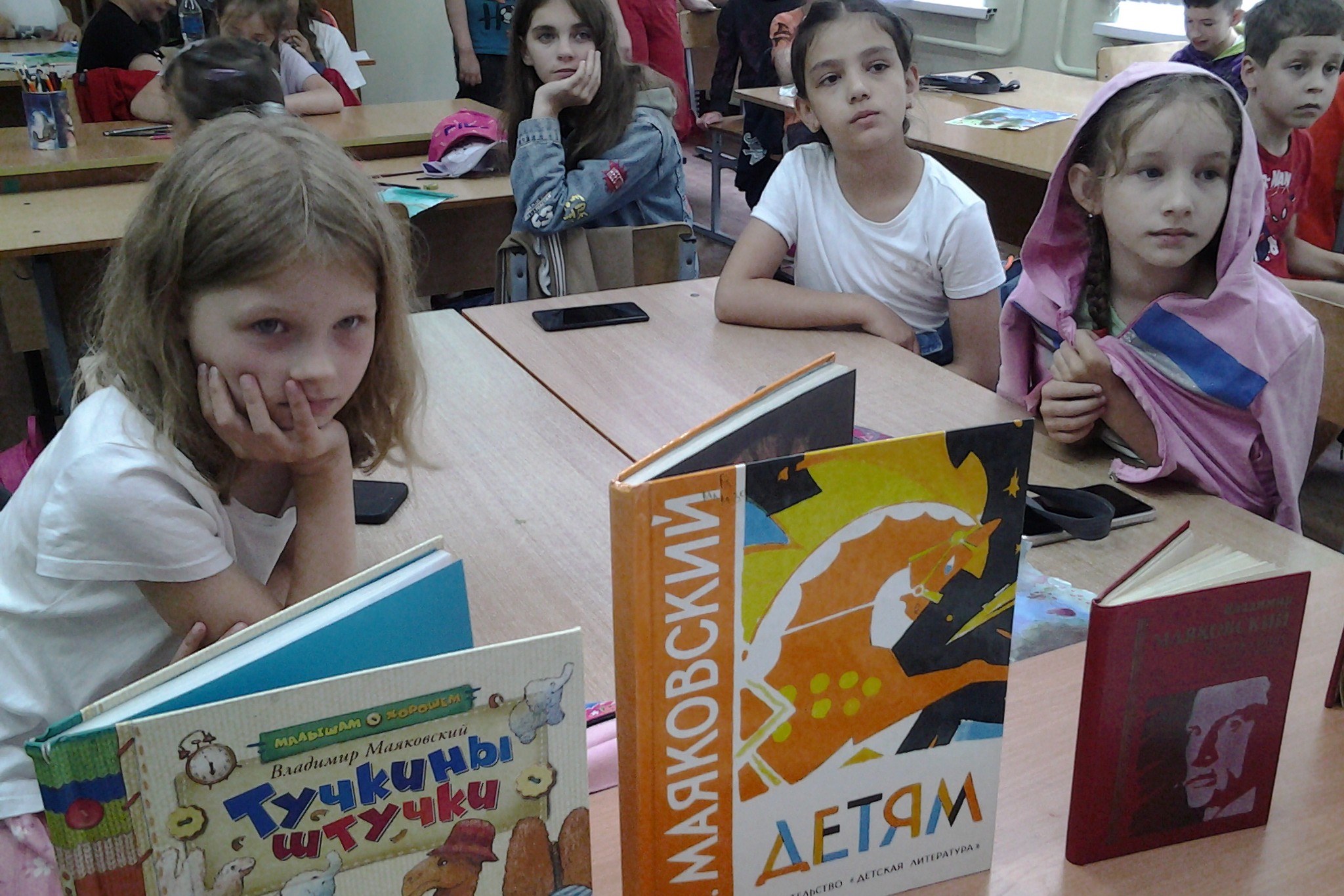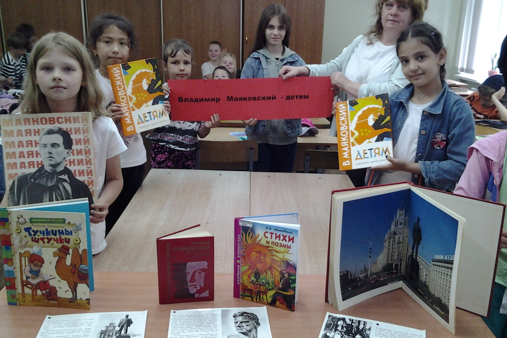 Встреча ребят, посещающих пришкольный лагерь СОШ № 43, и сотрудников библиотеки № 16 была посвящена творчеству одного из самых известных поэтов ХХ века Владимиру Владимировичу Маяковскому, чей 130-й юбилей отмечается в этом году.