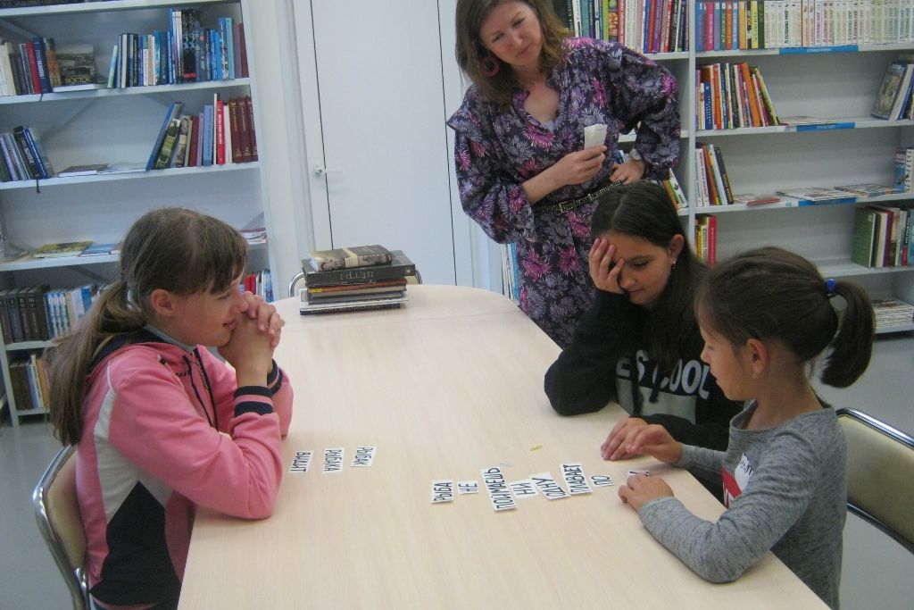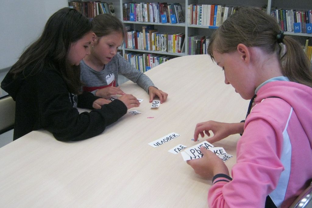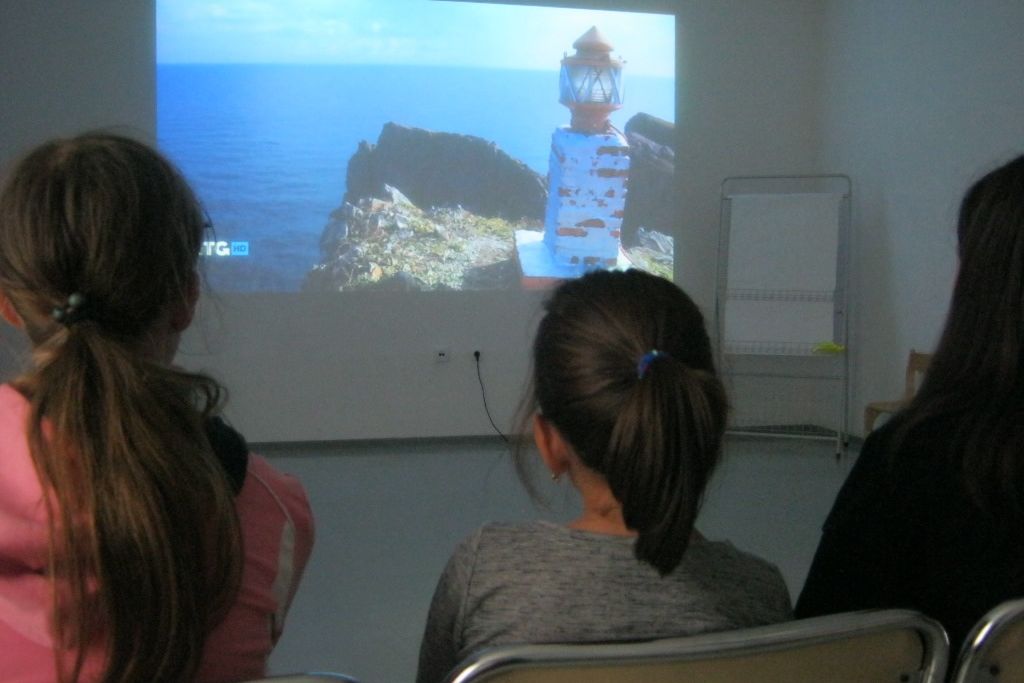 Потом девочки посоревновались, кто быстрее соберет поговорку и посмотрели фрагмент фильма RTG о Дальневосточном Морском биосферном заповеднике, где рассказывается о боевых дельфинах, которых раньше обучали в бухте Витязь.