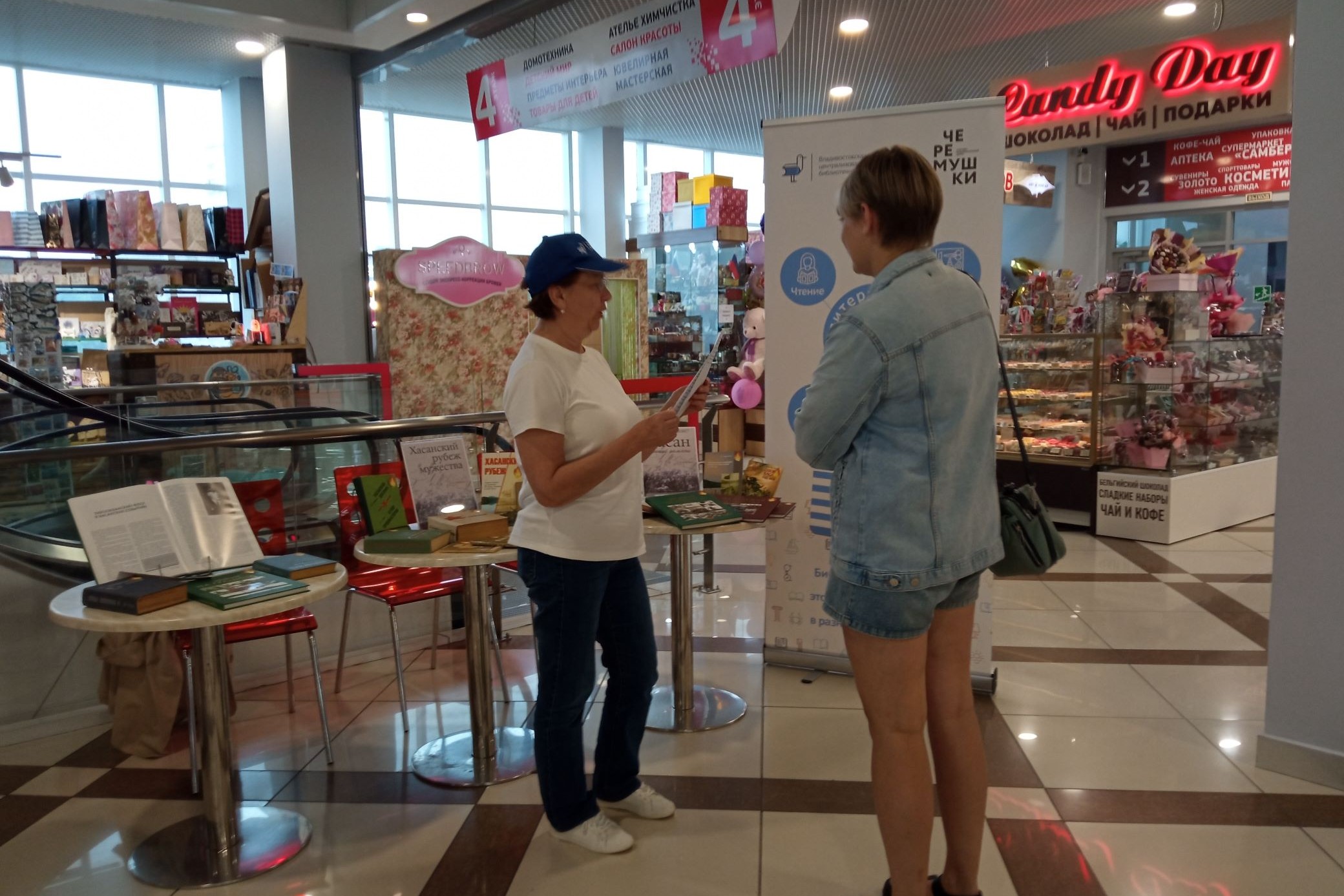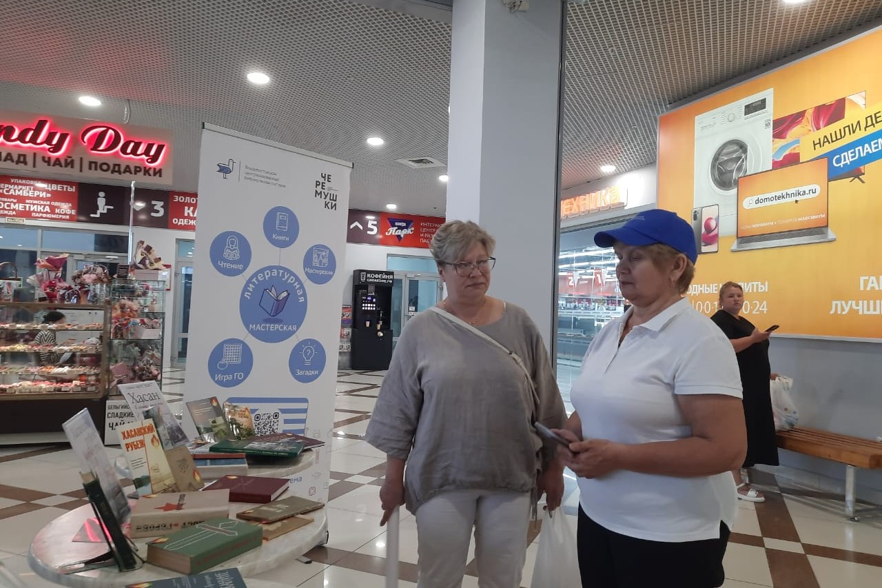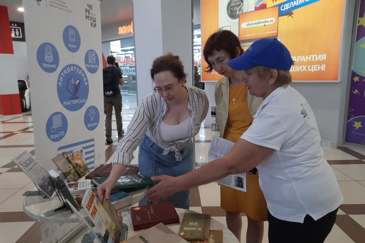 27 июля в ТРЦ «Черёмушки» традиционно работала Открытая библиотечная площадка МБУК «ВЦБС». В этот день внимание посетителей торгово-развлекательного центра было обращено на книжную инсталляцию «Хасанский рубеж мужества» в рамках проекта МБУК ВЦБС «Хасан в нашей памяти». Выставка посвящена событиям и героям пограничного конфликта в районе озера Хасан в 1938 году.