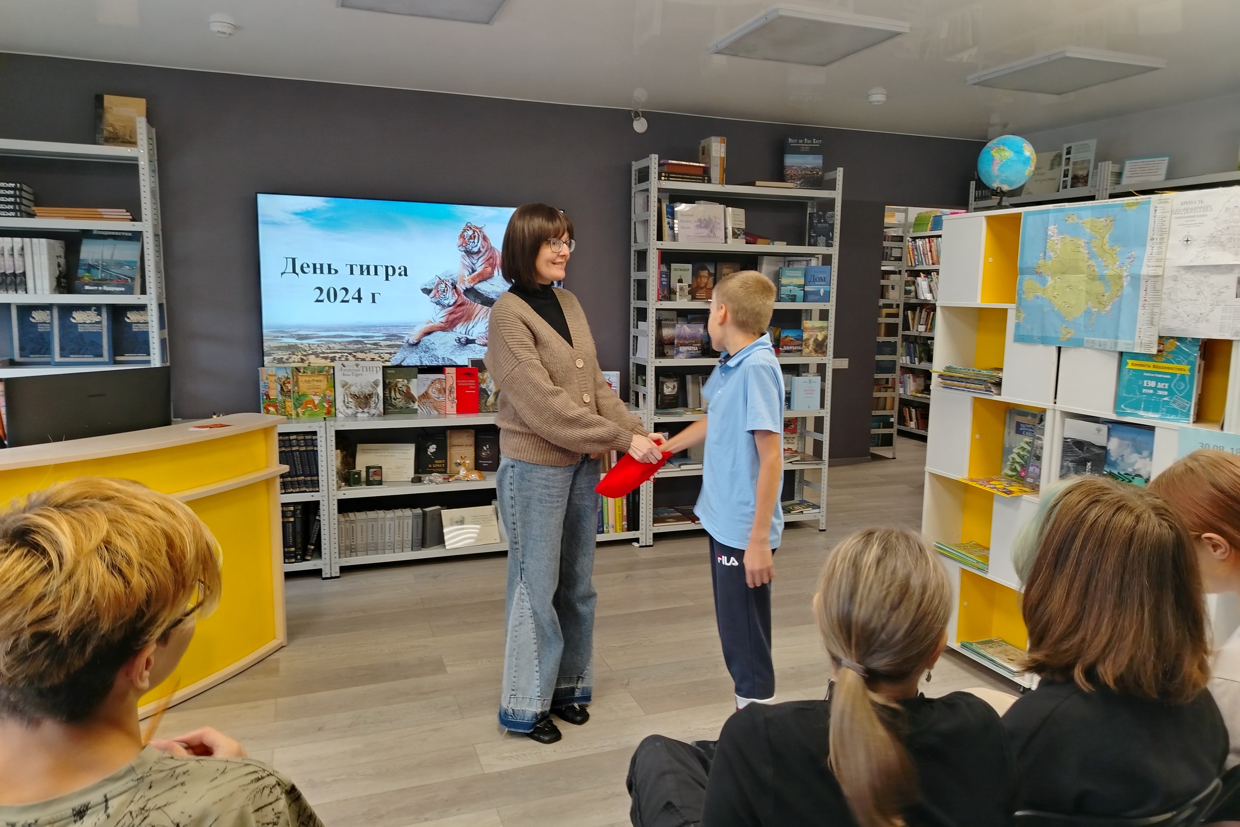 В библиотеке № 21 провели беседу и блиц-викторину для учащихся ДШИ № 4 по любимому празднику владивостокцев. Особый интерес вызвала блиц-викторина, на которую ребята отвечали очень хорошо. Они безошибочно назвали «тигровых» животных: креветку, лилию и акулу. Даже вопрос о способах охоты тигра не привел ребят в замешательство. За активное участие и знания юные художники получили небольшие памятные призы.
