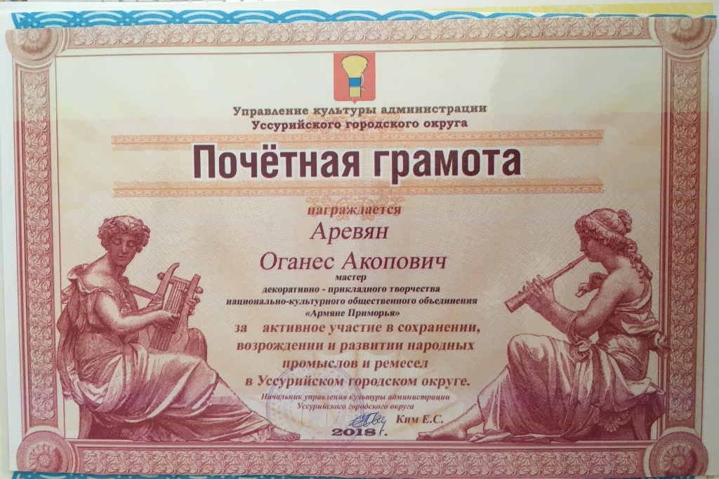 Целеустремленный и доброжелательный Аревян Оганес Акопович – замечательный художник, чья активная жизненная позиция вызывает уважения. Вся творческая деятельность этого мастера сделала его достойным присвоения 29 августа 2020 года звания «Народный мастер Приморского края» за выдающиеся достижения в области декоративно-прикладного искусства.