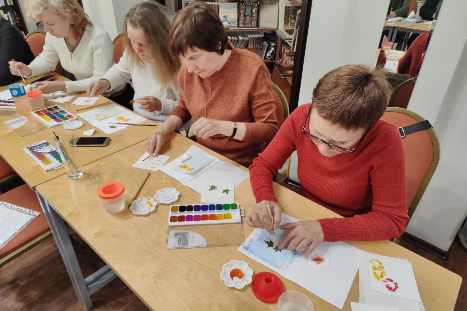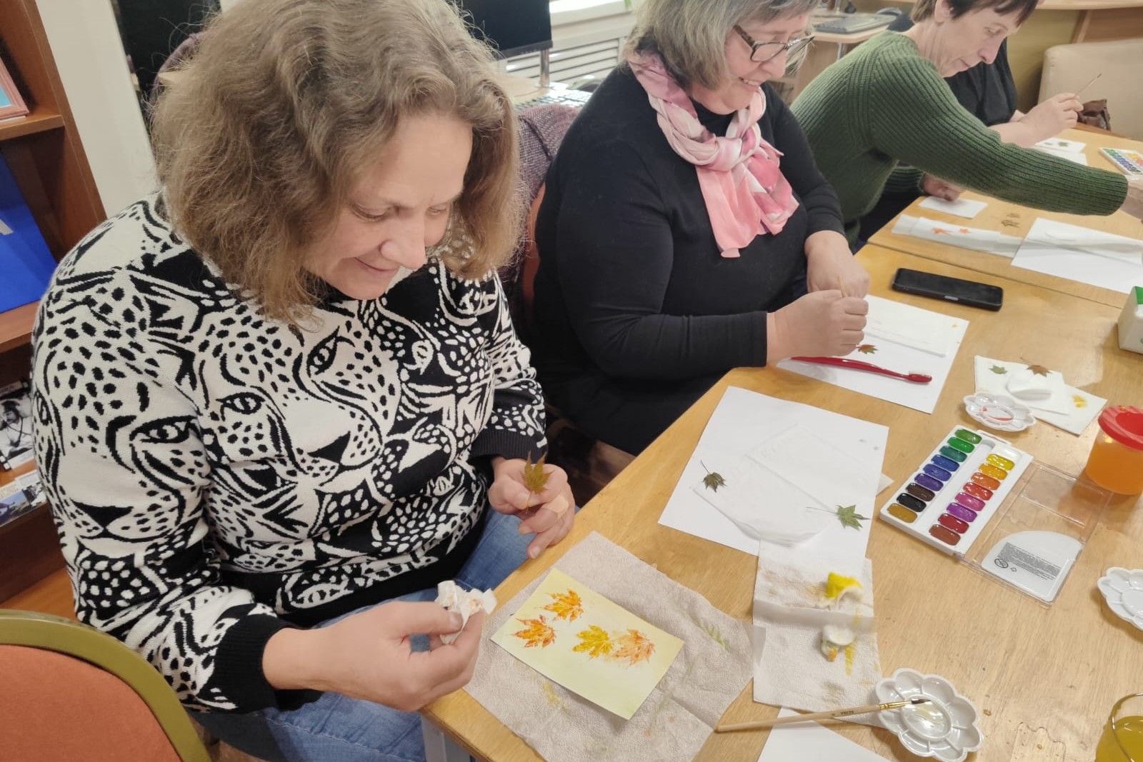 В заключении встречи каждый участник создал неповторимую акварельную открытку в технике эко-печати. Некоторые «художники» признались, что как в детстве испытали восторг и радость от творчества и ярких красок кленовых листьев.