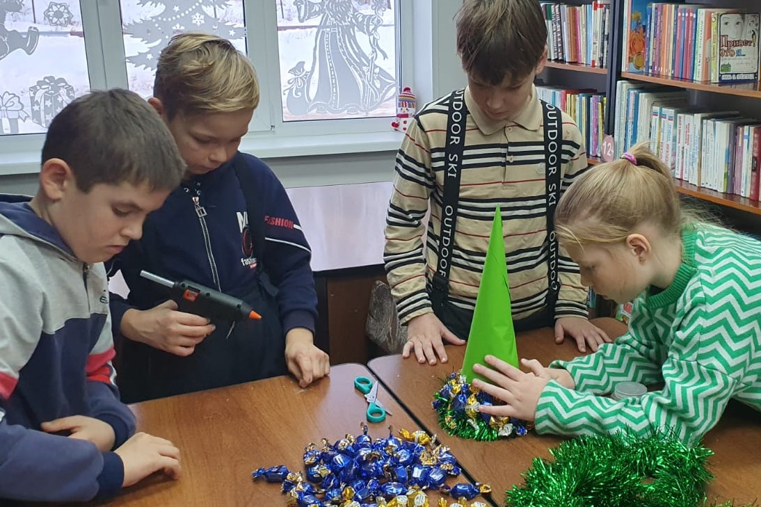 28 декабря в библиотеке состоялась творческая мастерская «Замышляем Новый год». Ребята решили сделать подарок школьным учителям – новогоднюю ёлку. Используя мишуру и конфеты, получилась очень красивая и нарядная ёлочка. Во время творчества ребята вспоминали традиции новогодних праздников. Мероприятие прошло очень весело и интересно.