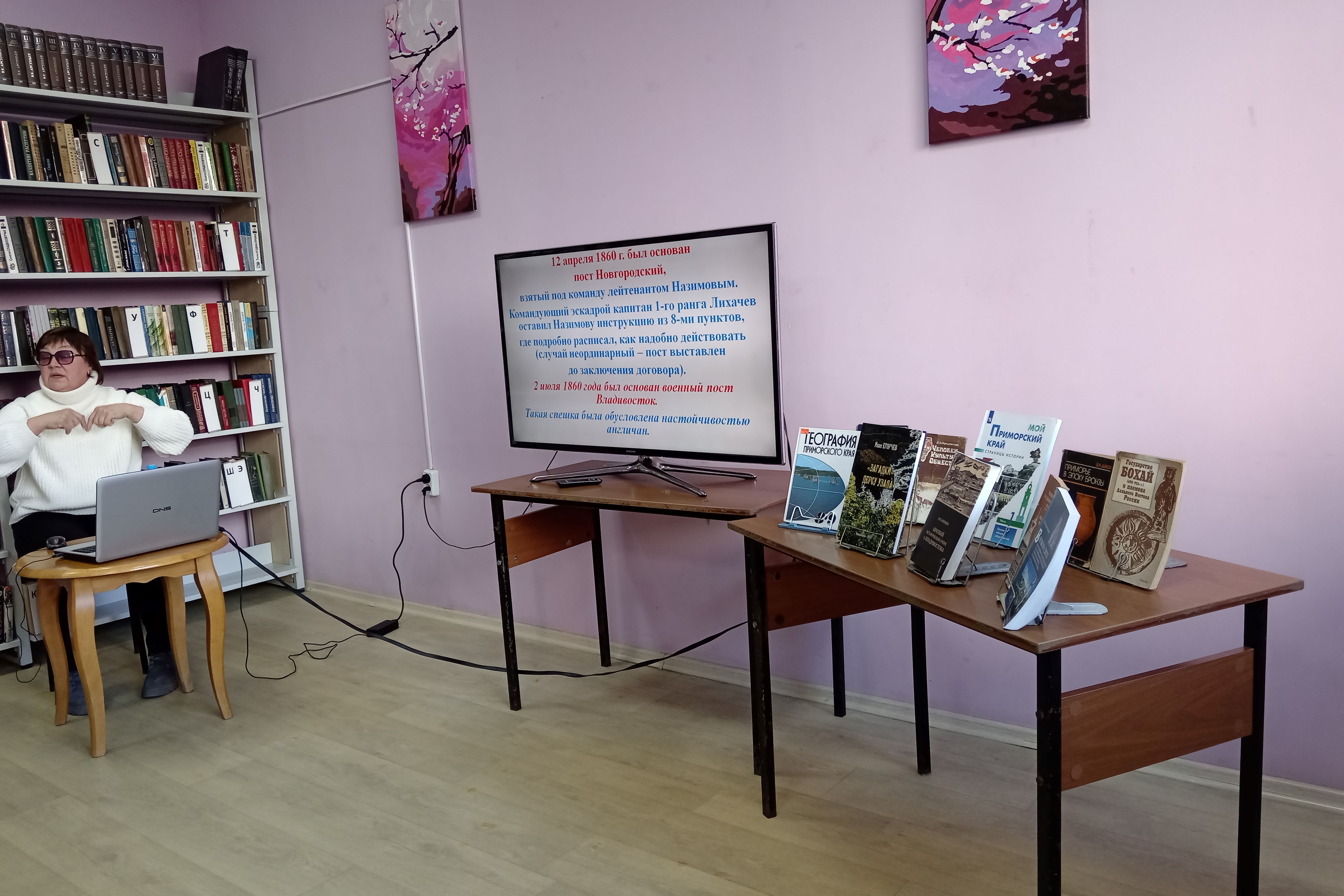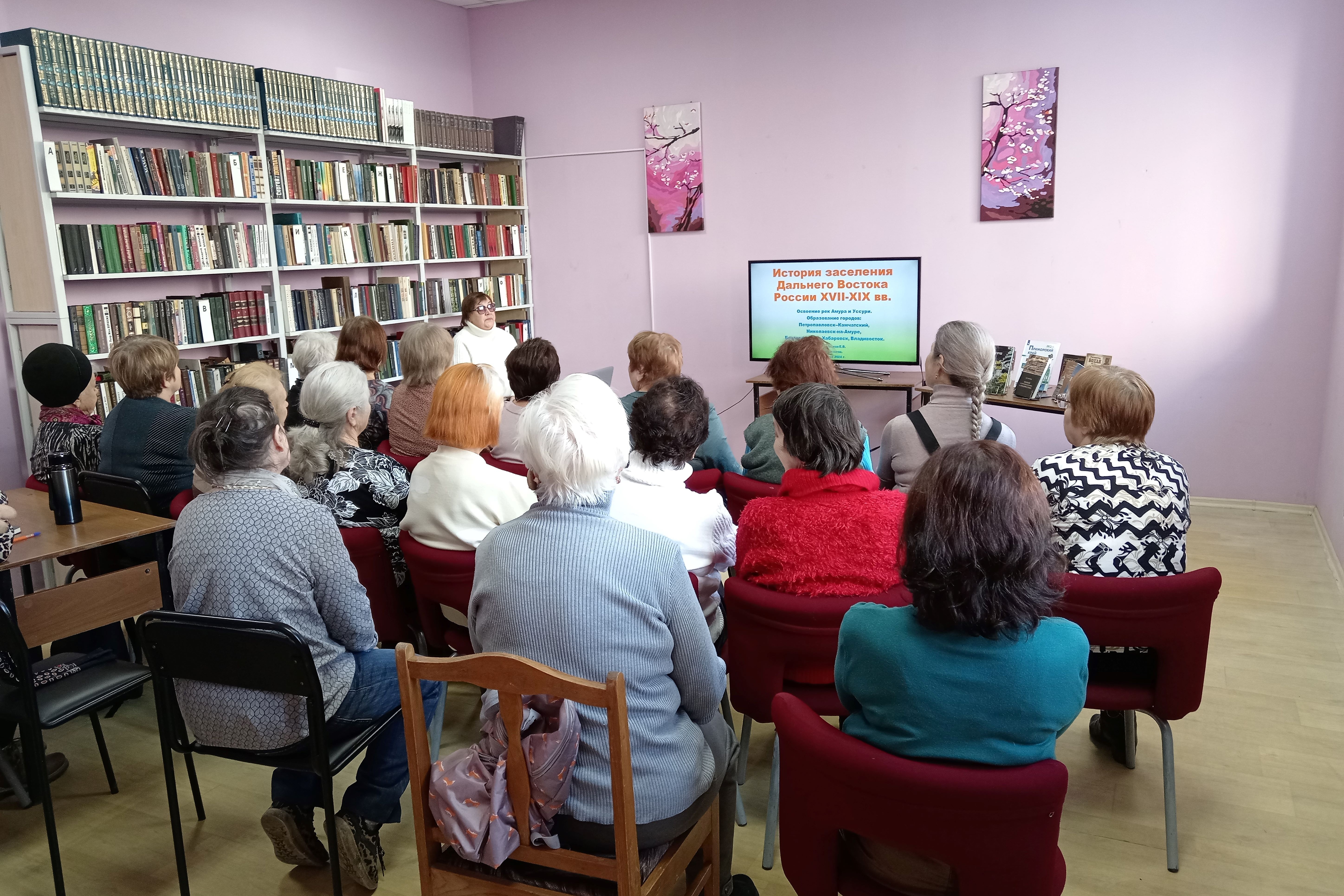 Елена Васильевна познакомила участников встречи с освоением Дальнего Востока от первых маршрутов Ермака, рассказала об административном выделении Восточной и Западной Сибири, а также освоении Амура и подписании Пекинского договора. Присутствующие с большим вниманием слушали лекцию, ведь материал был настолько оригинальным и увлекательным – многие факты были для них в новинку. Елена Васильевна как истинный энтузиаст своего дела заинтересовала аудиторию историей Приморского края, познакомила с «бестселлерами» краеведческой литературы и показала памятники основателям Дальнего Востока и Сибири.