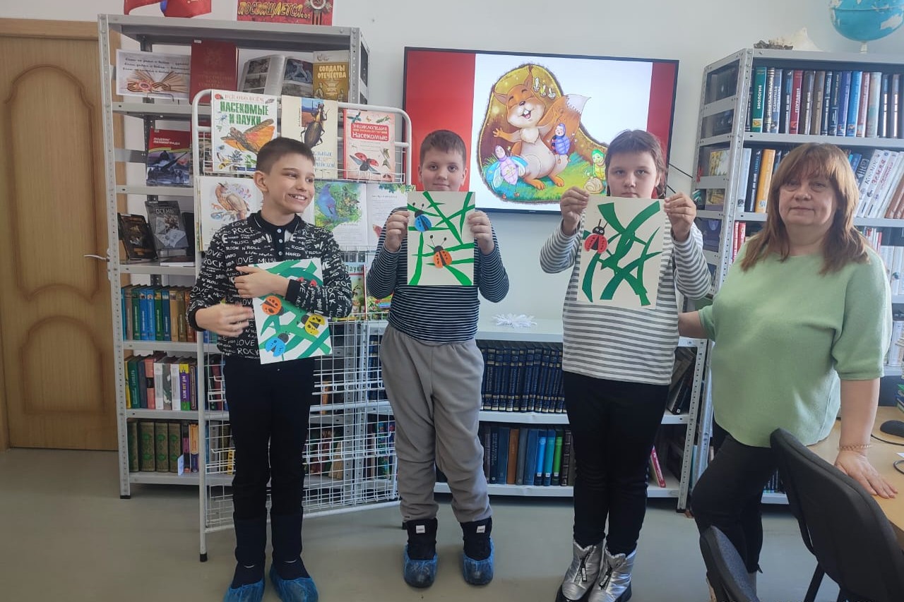 На занятии в библиотеке дети узнавали о том, как и где зимуют насекомые. Божьи коровки собираются большими кучками, ищут тёплое местечко и вместе зимуют. Они выбирают места на солнечной стороне под большими камнями, кучей опавшей листвы, могут скрываться под корой деревьев, в щелях домов, трещинах. Муравьи переезжают из наземного дома в подвальный этаж — специальную камеру в земле под муравейником. Разные жучки зимуют в сухой траве, расщелинах старых пней, прячутся под корой деревьев. Есть среди них такие, что пережидают холод в воде — это жуки-плавунцы. Они плавают под коркой льда, питаются водными растениями и дышат воздушными пузырьками.