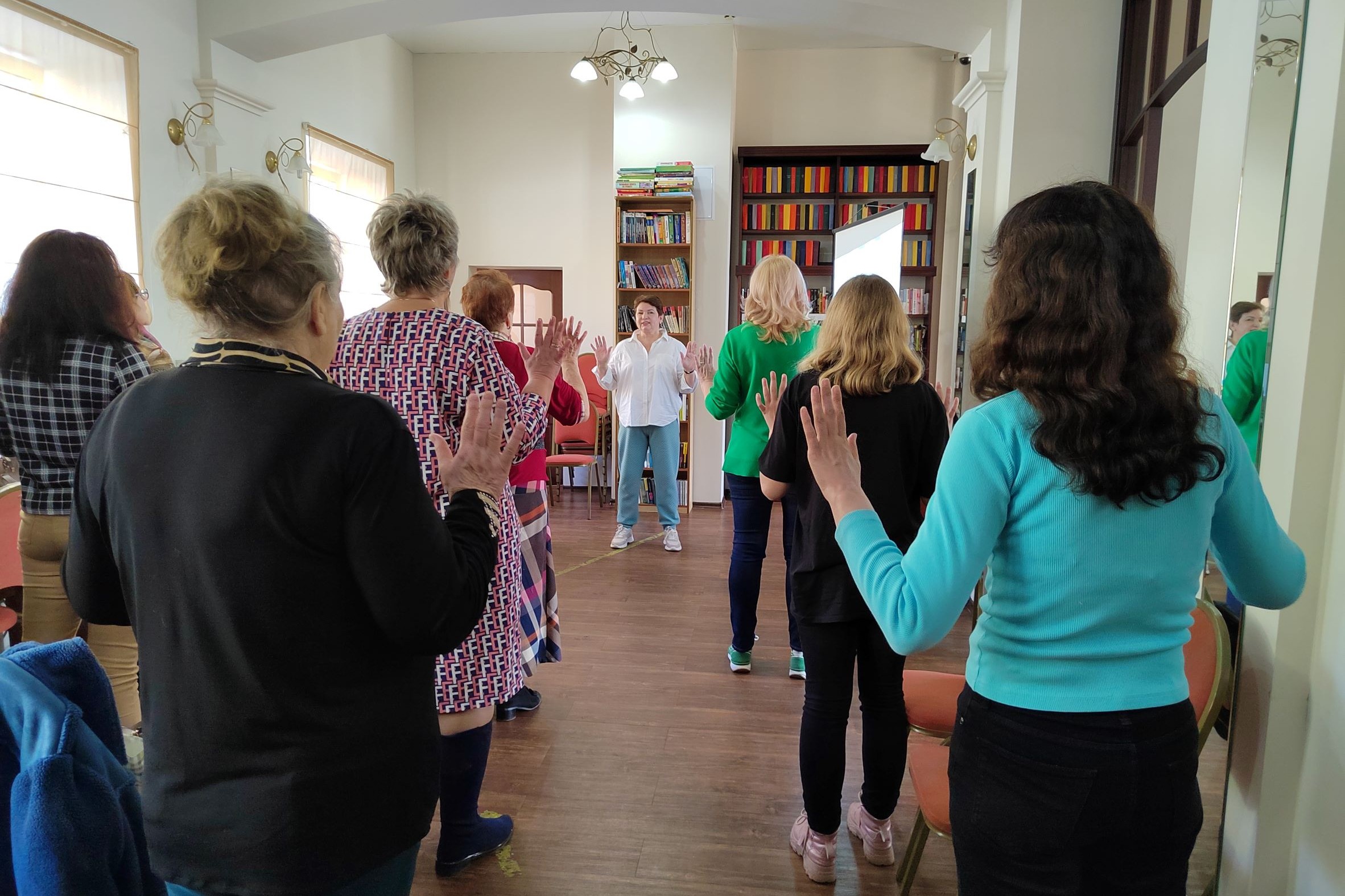 Также Оксана Владимировна рассказала, что особой популярностью занятий йогой смеха стали пользоваться в качестве восстановительной терапии после перенесённого COVID, ведь йога смеха – это отличная дыхательная гимнастика, упражнения укрепляют дыхательную систему, иммунитете, тренируют сердце, а самое главное – йога смеха способствует формированию у себя навыка позитивного мышления. Участницы сделали медитацию, дыхательную гимнастику, пропели определенные звуки, отметили, что смех – отличный фейс-фитнес. В итоге участницы тренинга согласились, что смех продлевает жизнь, ведь у всех улучшилось настроение, а смех заразительно воздействовал на просто зашедших за книгой читателей. Также участницы согласились с мнением и рассказом Оксаны Владимировны, что смех сближает семьи, коллективы, компании, йога смеха сейчас практикуется уже и на некоторых предприятиях.