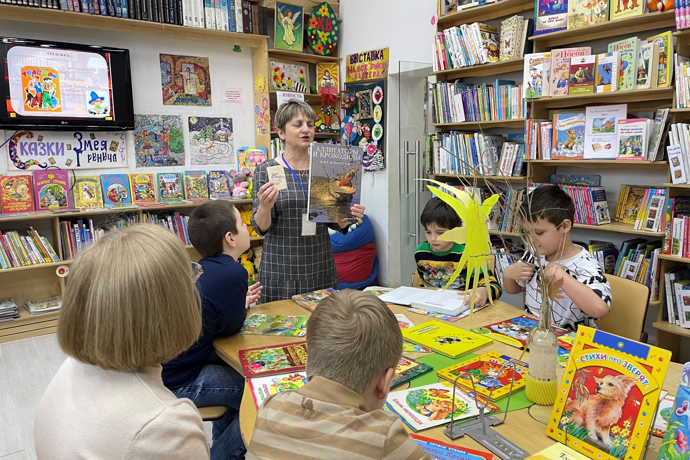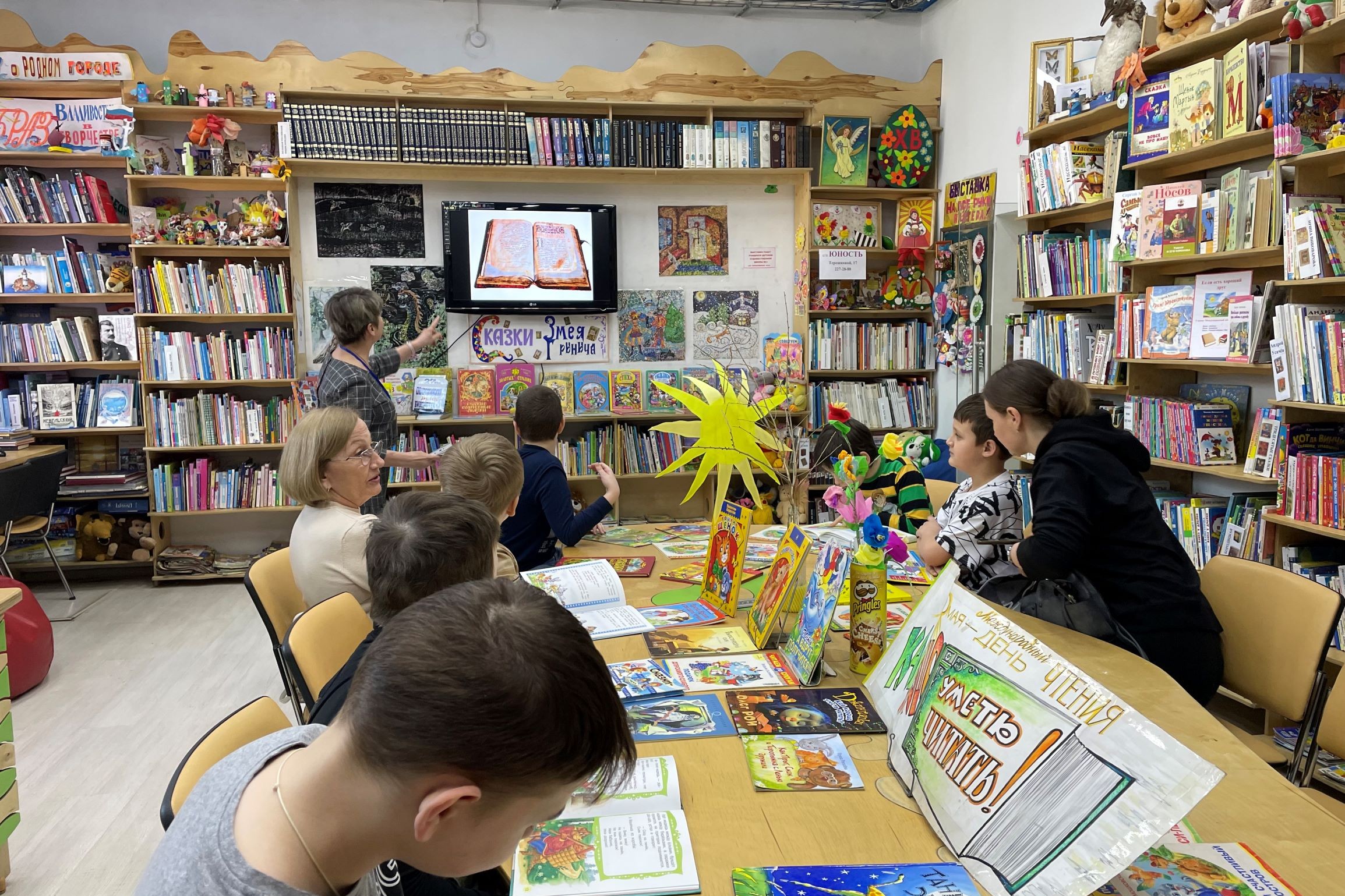 Пятиклассники (дети с расстройством аутического спектра) долго ждали похода в библиотеку и, наконец, 23 мая они совершили это увлекательное путешествие. Первоклассники школы № 74 тоже путешествовали по библиотеке, но вначале услышали рассказ про старинные книжки, увидели их на экране и были очень удивлены, увидев, сколько книг разной формы и размера можно найти в библиотеке. Особенно их поразили книжки-малютки. Дети потом сравнили самую маленькую книжку с самой большой. Они узнали о таком празднике как День славянской письменности и культуры. Юные читатели внимательно слушали рассказ об истории возникновения письменности, сравнивали буквы, которые они уже выучили с буквами кириллицы.